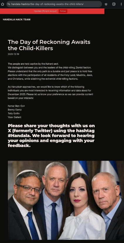 وأضافت المجموعة: “المسار الوحيد لسلام دائم وعادل هو إجراء انتخابات حرة بمشاركة جميع سكان الأرض المقدسة، من مسلمين ويهود ومسيحيين، مع تهميش الفصائل المتطرفة القاتلة للأطفال”. وأشارت إلى قرب عيد الحانوكا، مطالبة بمعرفة الأفراد الذين يهتم الجمهور الإسرائيلي بمتابعتهم خلال شهر ديسمبر 2025، لتقديم المحتوى المناسب لهم، مستهدفة وزير الأمن القومي إيتمار بن غفير، والوزير السابق بيني جانتس، وعضو الكنيست تالي جوتليب، ووزير الدفاع الأسبق يوآف جالانت، مع نشر صورة لهم.
