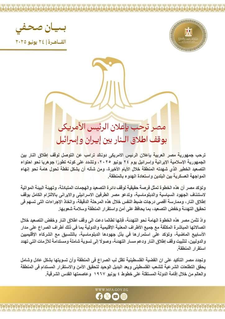رحبت مصر، فى بيان صادر عن وزارة الخارجية الثلاثاء، بإعلان الرئيس الأمريكي دونالد ترامب عن التوصل لوقف إطلاق النار بين الجمهورية الإسلامية الإيرانية وإسرائيل اليوم .