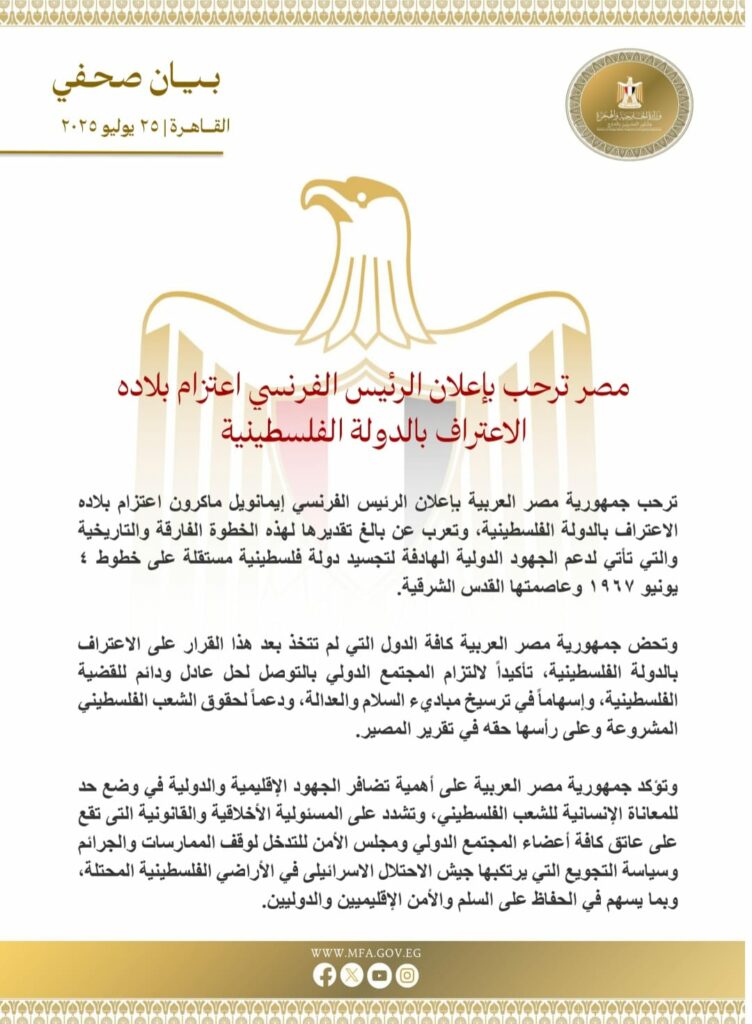 رحبت مصر، فى بيان صادر عن وزارة الخارجية والهجرة اليوم الجمعة، بإعلان الرئيس الفرنسي إيمانويل ماكرون اعتزام بلاده الاعتراف بالدولة الفلسطينية.