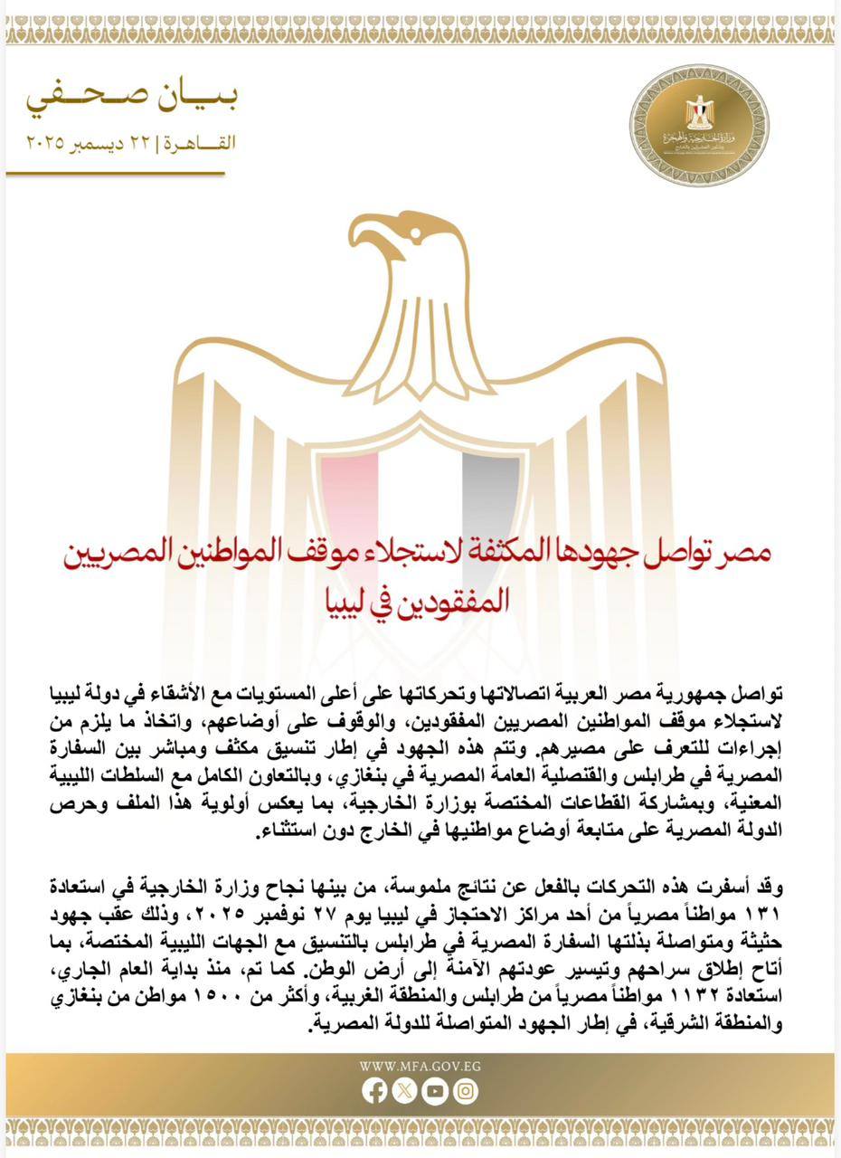 وتتم هذه الجهود في إطار تنسيق مكثف ومباشر بين السفارة المصرية في طرابلس والقنصلية العامة المصرية في بنغازي، وبالتعاون الكامل مع السلطات الليبية المعنية، وبمشاركة القطاعات المختصة بوزارة الخارجية، بما يعكس أولوية هذا الملف وحرص الدولة المصرية على متابعة أوضاع مواطنيها في الخارج دون استثناء.