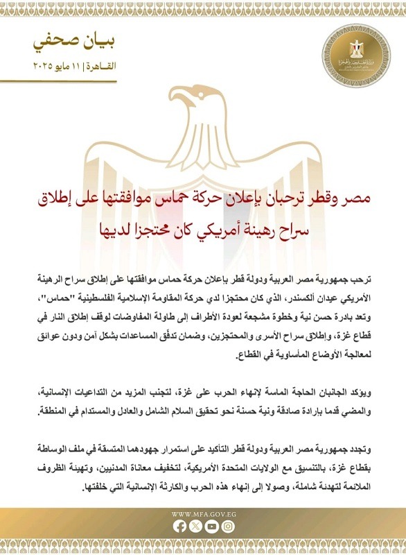 رحبت جمهورية مصر العربية ودولة قطر بإعلان حركة حماس موافقتها على إطلاق سراح الرهينة الأمريكي عيدان ألكسندر، الذي كان محتجزا لدي حركة المقاومة الإسلامية الفلسطينية “حماس”، وتعد بادرة حسن نية وخطوة مشجعة لعودة الأطراف إلى طاولة المفاوضات لوقف إطلاق النار في قطاع غزة، وإطلاق سراح الأسرى والمحتجزين، وضمان تدفّق المساعدات بشكل آمن ودون عوائق لمعالجة الأوضاع المأساوية في القطاع.