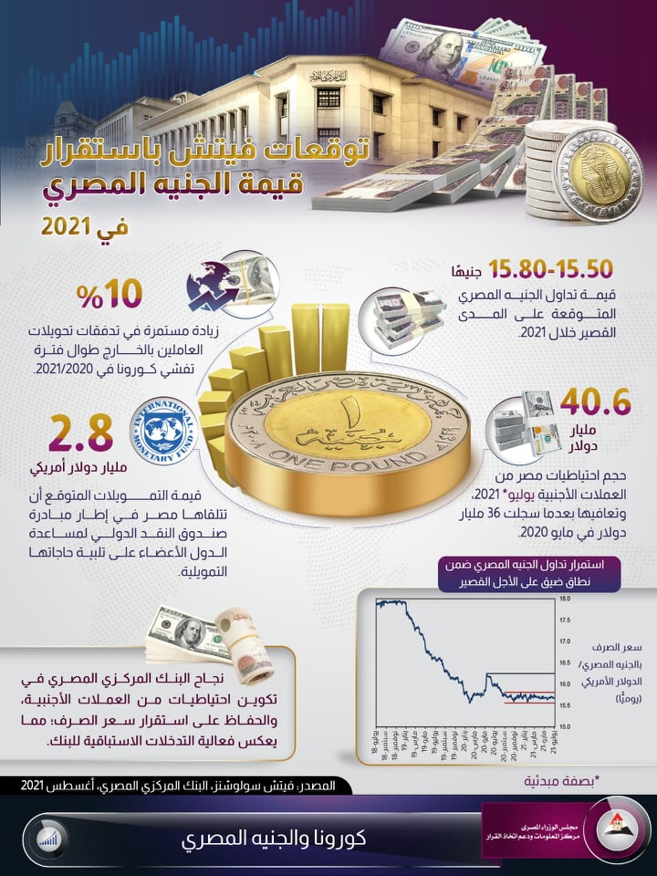 أظهر مركز المعلومات ودعم اتخاذ القرار بمجلس الوزراء، توقعات مؤسسة “فيتش سولوشنز” باستمرار تداول الجنيه المصري ضمن نطاق ضيق على الأجل القصير، متوقعة بأن تتراوح قيمة تداول الجنيه المصري بين (15.50-15.80) جنيهًا على المدى القصير خلال 2021.