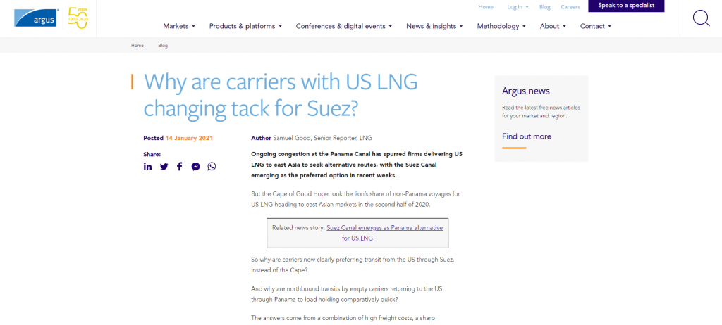 رصد التقرير التحليلي الذي نشرته منظمة “ARGUS” على موقعها الرسمي تحت عنوان” لماذا تُغير الناقلات المُحملة بالغاز الطبيعي المُسال الأمريكي طريقها إلى قناة السويس؟” نجاح هيئة قناة السويس في جذب النسبة الأكبر من الناقلات العاملة على طريق نقل تجارة الغاز الطبيعي المُسال بين الولايات المتحدة الأمريكية و دول شرق آسيا (الشرق الأقصى) منذ بداية العام الجاري مقارنة بالمسارات والقنوات المُنافسة.