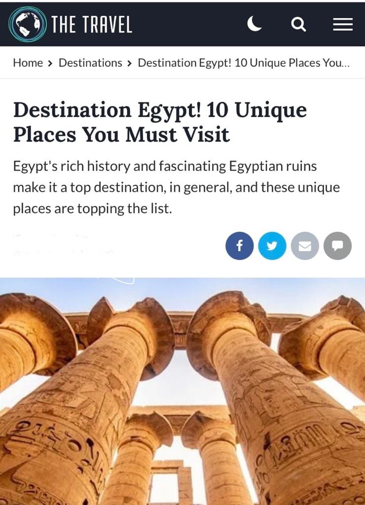 أبرز موقع The Travel السياحي المتخصص، في تقرير له، تحت عنوان “المقصد السياحي المصري… عشر أماكن فريدة يجب عليك زيارتها في مصر”، عشرة أماكن سياحية متميزة في مصر، وأشار خلاله إلى أن تاريخ مصر الغني والآثار المصرية الرائعة يجعلها الوجهة الأولى بصفة عامة.