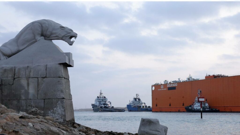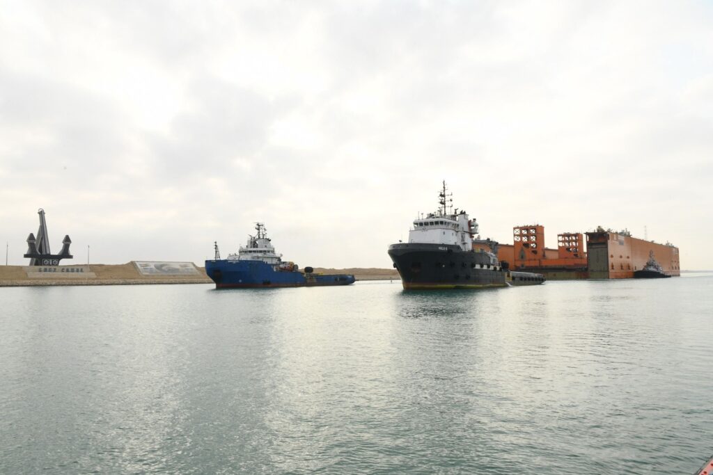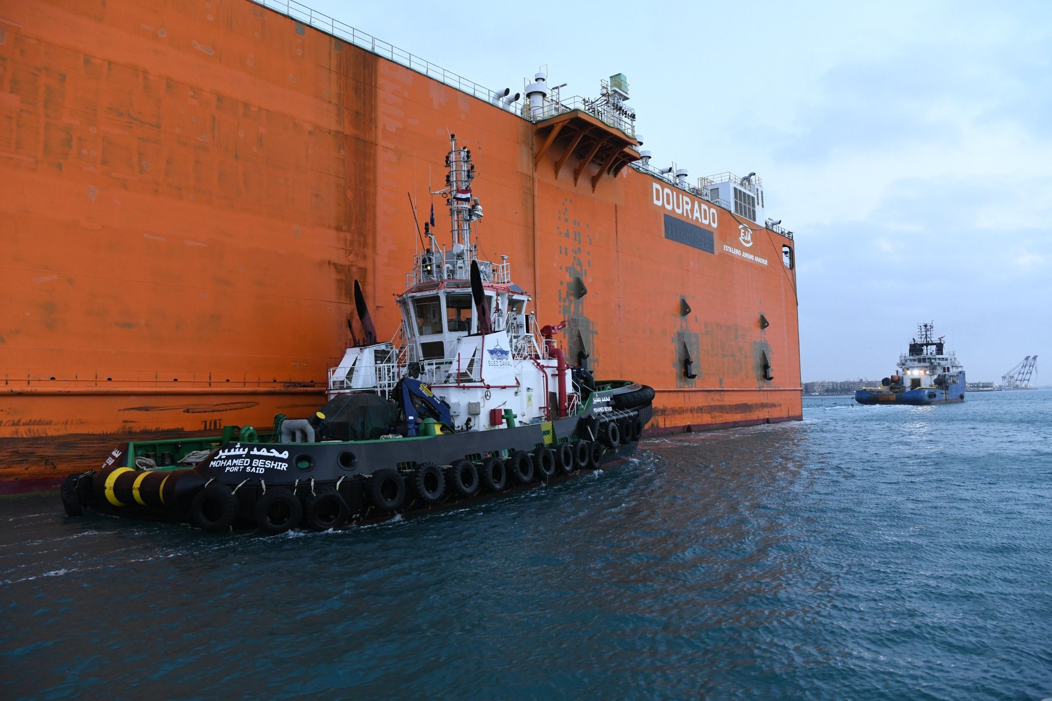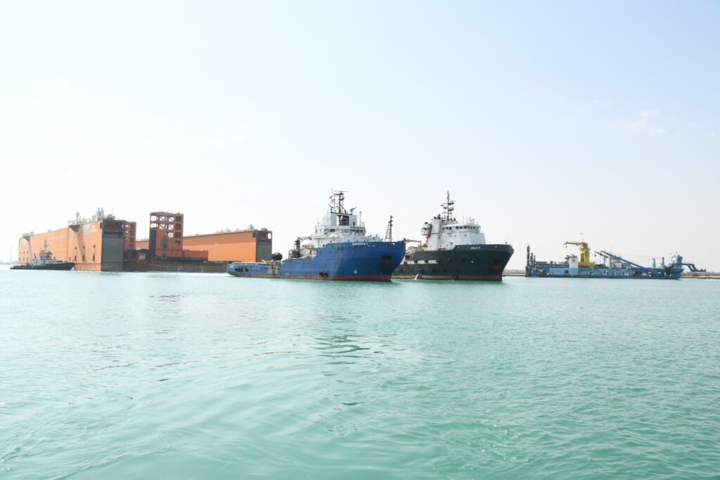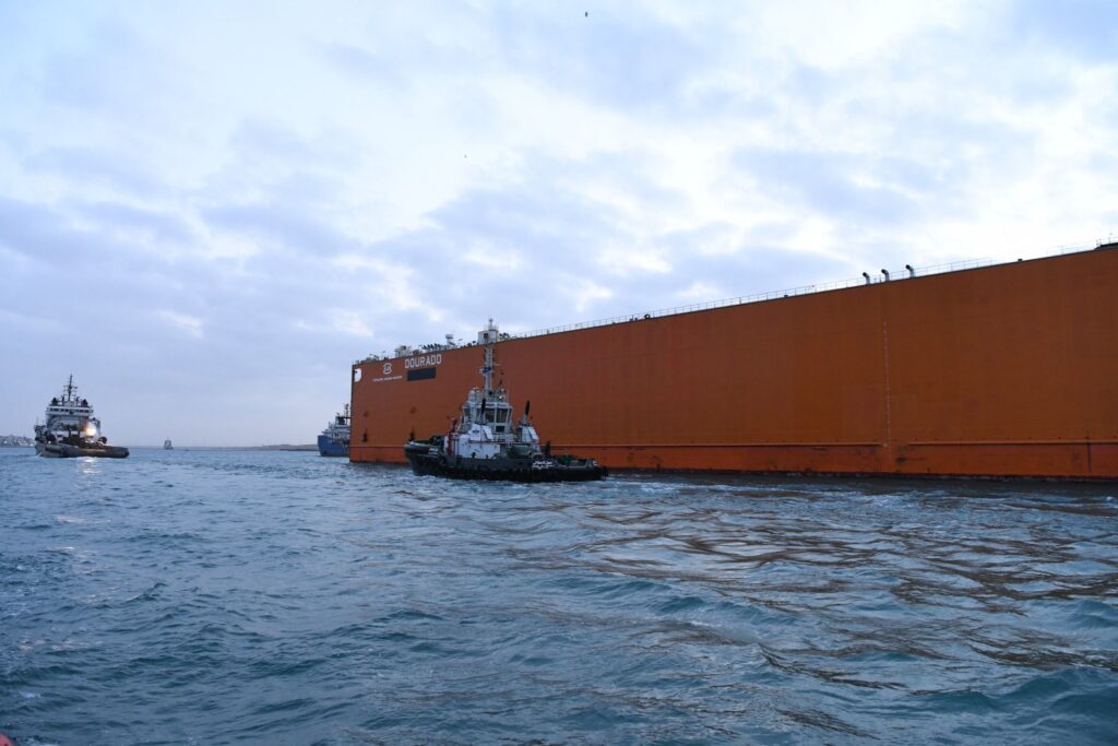 الحوض العائم ” DOURADO ” بعرض 90 مترا ضمن قافلة الجنوب بالمجرى الملاحي الجديد للقناة، مقطورا من الأمام بواسطة قاطرتين مصاحبتين، مع توجيهه من خلال خمسة قاطرات تابعة للهيئة وإرشادها بواسطة فريق يضم مجموعة من كبار مرشدي الهيئة وقباطنة القاطرات خلال رحلته البحرية قادما من سنغافورة ومتجها إلى تركيا.