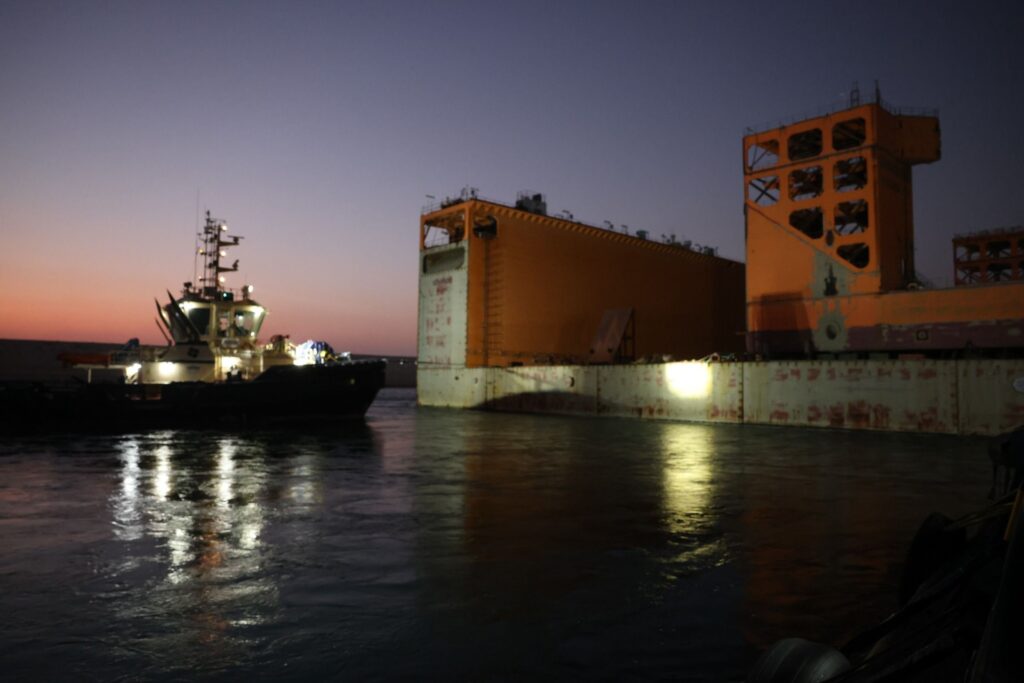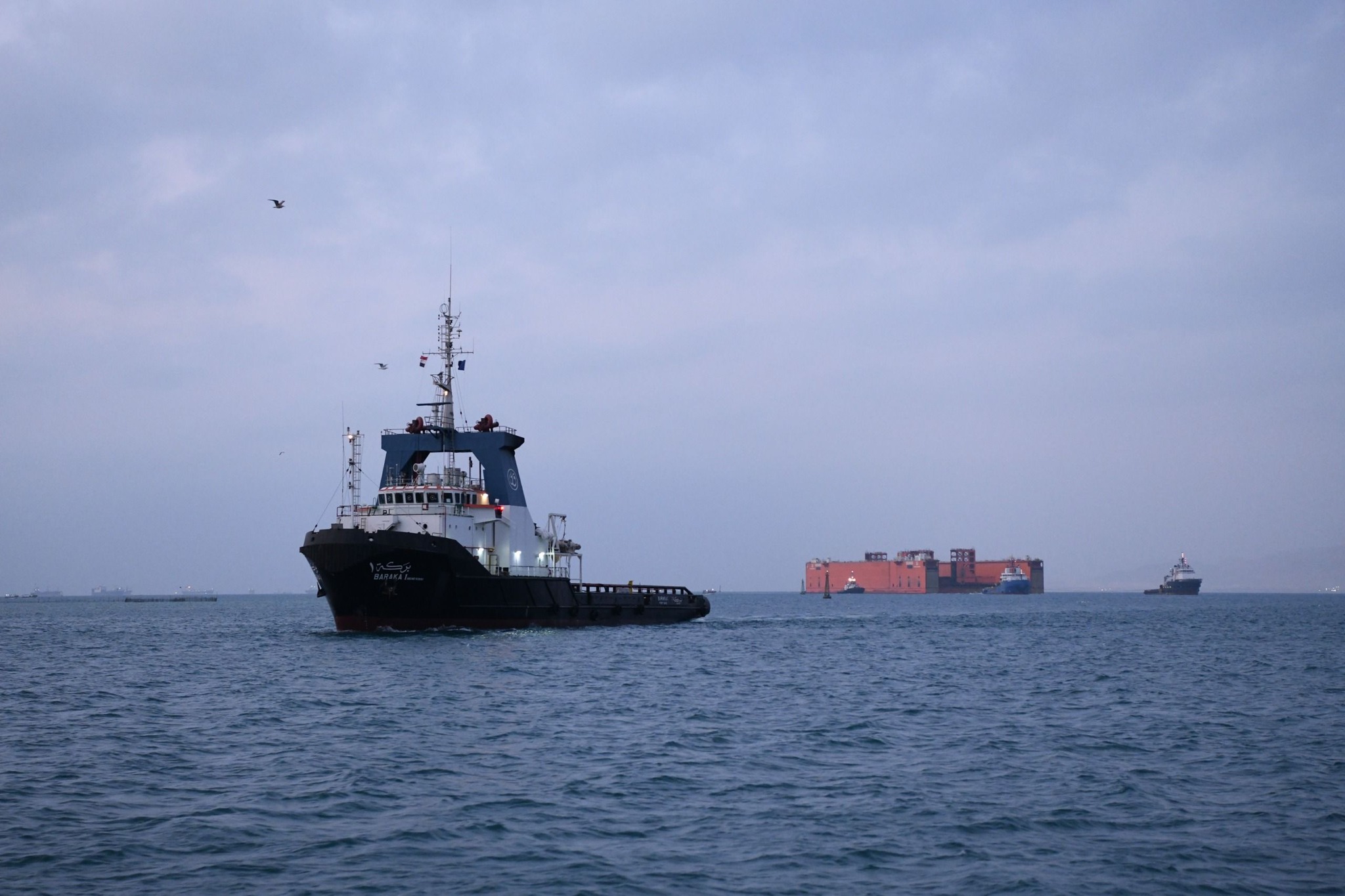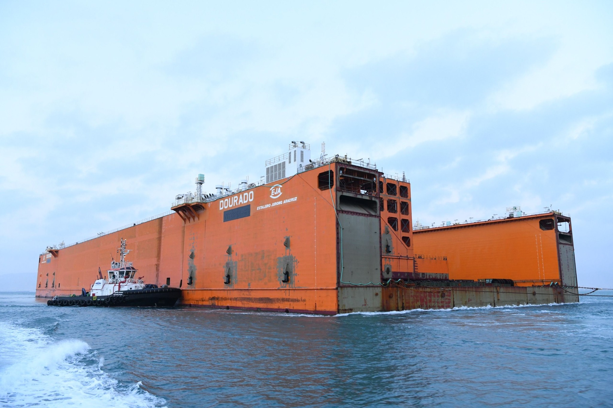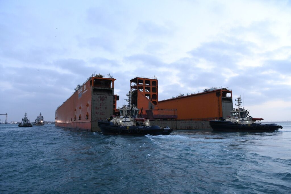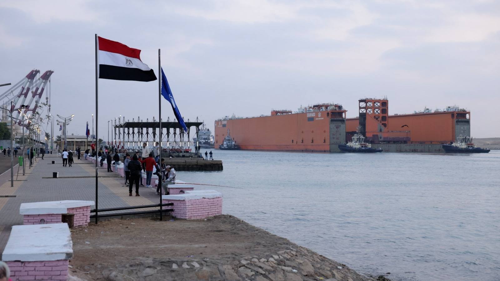 الحوض العائم ” DOURADO ” بعرض 90 مترا ضمن قافلة الجنوب بالمجرى الملاحي الجديد للقناة، مقطورا من الأمام بواسطة قاطرتين مصاحبتين، مع توجيهه من خلال خمسة قاطرات تابعة للهيئة وإرشادها بواسطة فريق يضم مجموعة من كبار مرشدي الهيئة وقباطنة القاطرات خلال رحلته البحرية قادما من سنغافورة ومتجها إلى تركيا.