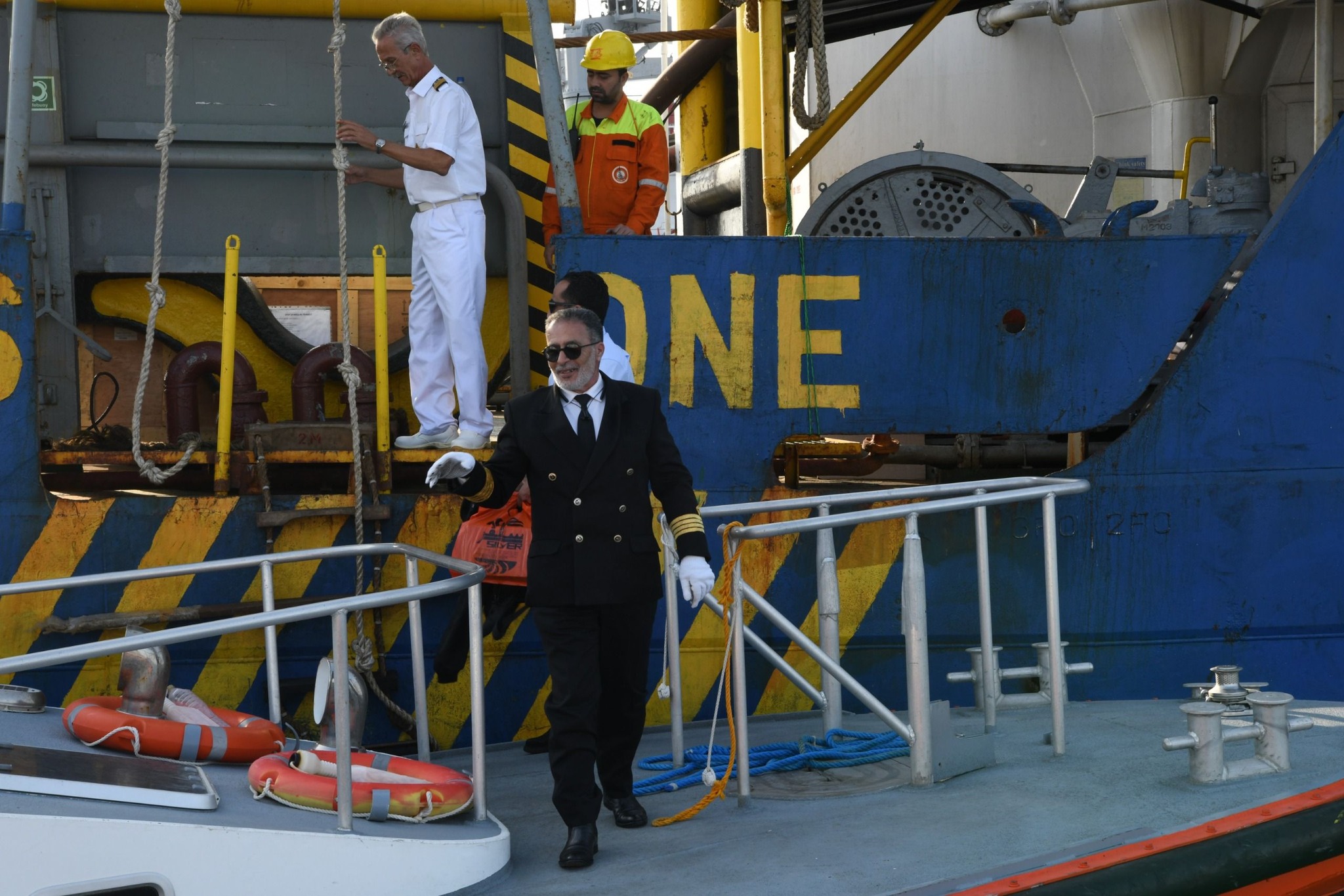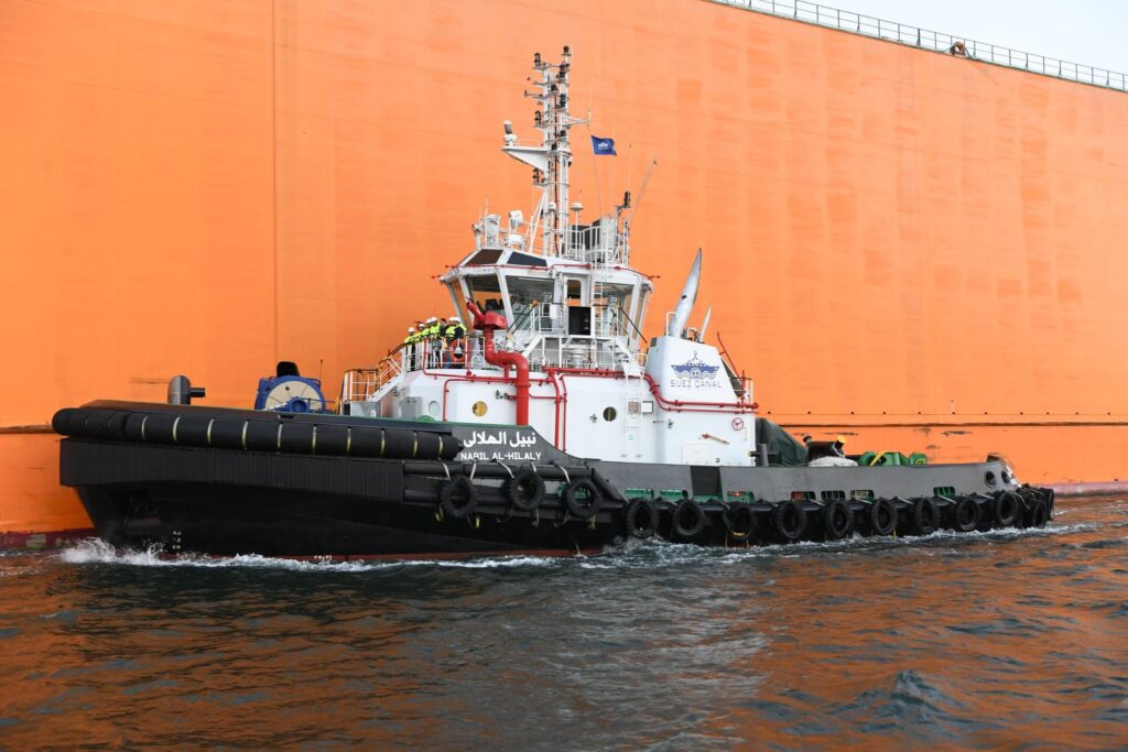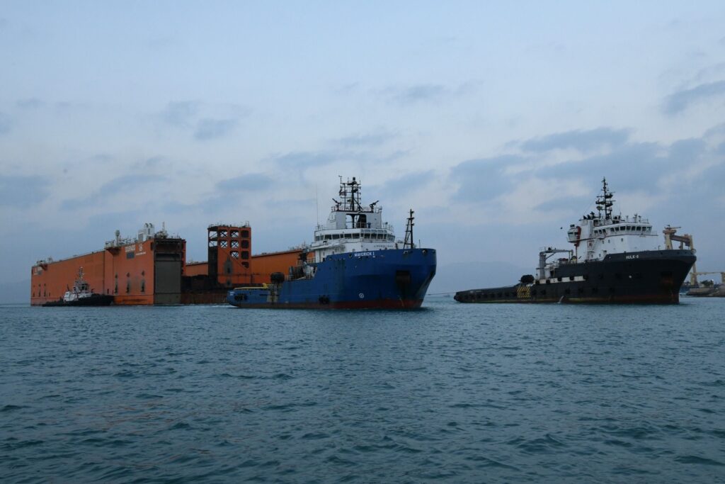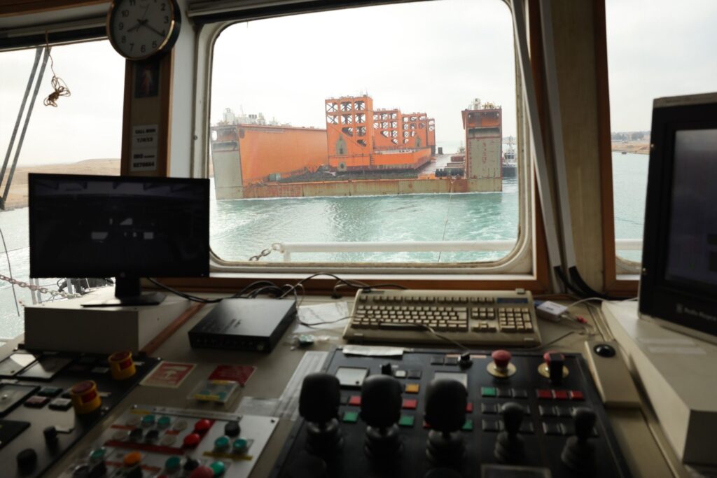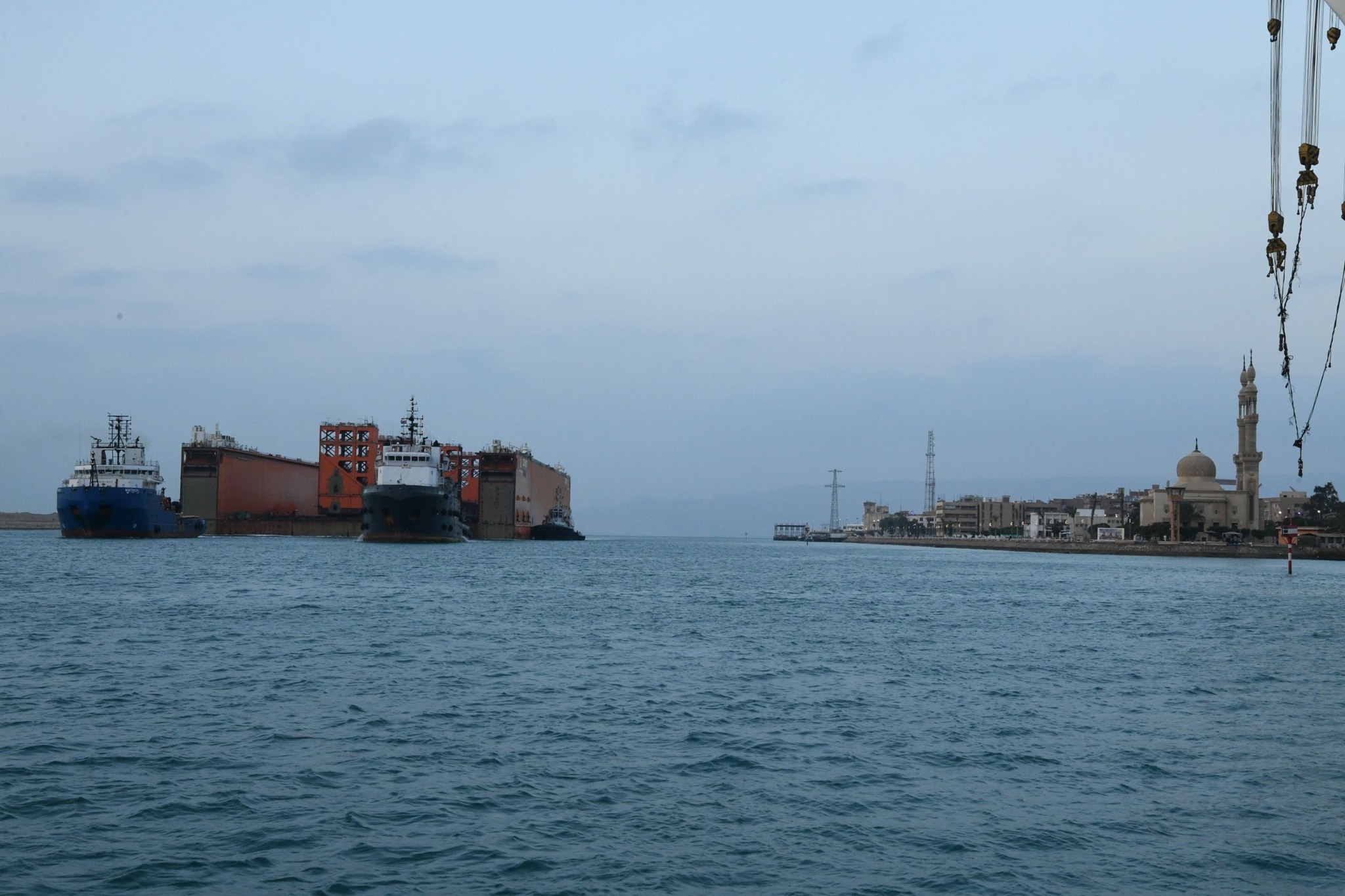 الحوض العائم ” DOURADO ” بعرض 90 مترا ضمن قافلة الجنوب بالمجرى الملاحي الجديد للقناة، مقطورا من الأمام بواسطة قاطرتين مصاحبتين، مع توجيهه من خلال خمسة قاطرات تابعة للهيئة وإرشادها بواسطة فريق يضم مجموعة من كبار مرشدي الهيئة وقباطنة القاطرات خلال رحلته البحرية قادما من سنغافورة ومتجها إلى تركيا.