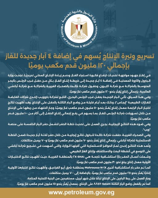 في إطار جهود مواجهة تحديات ارتفاع فاتورة استيراد الغاز، ودعم زيادة الإنتاج المحلي تدريجيًا، نجحت وزارة البترول والثروة المعدنية في إضافة 4 آبار جديدة إلى خريطة إنتاج الغاز، بكلٍ من حقل غرب البرلس بالبحر المتوسط بالشراكة مع شركة كايرون، وحقول شركة خالدة بالصحراء الغربية بالشراكة مع شركة أباتشي العالمية، بإجمالي إنتاج يُقدَّر بنحو 120 مليون قدم مكعب غاز يوميًا.