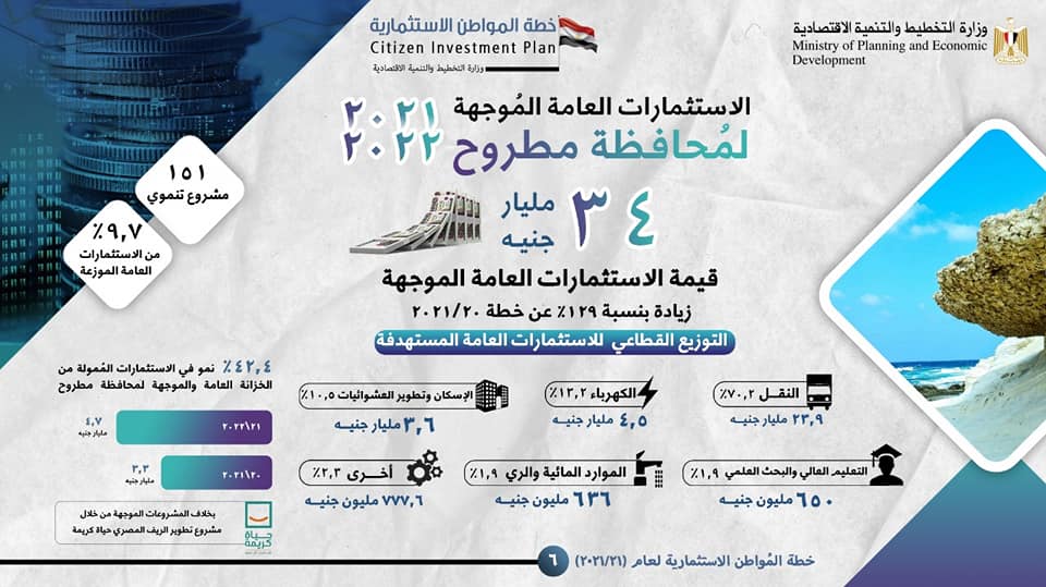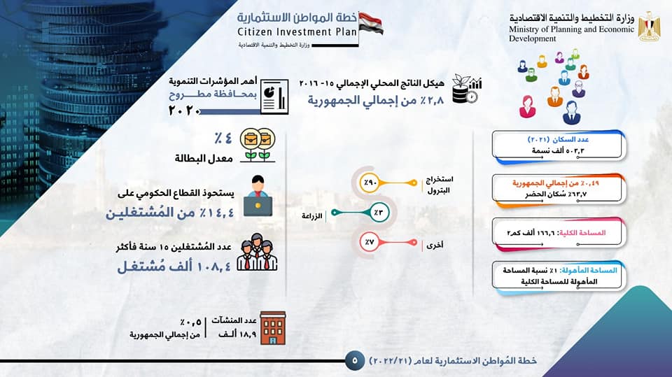 استعرضت وزارة التخطيط والتنمية الاقتصادية في تقرير صادر عنها ملامح خطة المواطن الاستثمارية لمحافظة مطروح لعام 21/2022 ، وذلك في إطار مواصلة الإعلان عن خطة المواطن في كافة محافظات الجمهورية للعام الثالث على التوالي، بهدف توعية المواطنين بشأن توجهات وأولويات خطة التنمية المستدامة للعام المالي (21/2022)، ودورها في تحقيق “رؤية مصر 2030”.