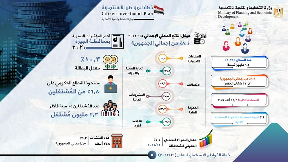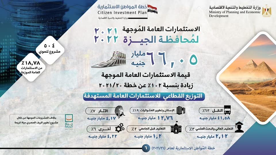 أصدرت وزارة التخطيط والتنمية الاقتصادية تقريرا بشأن خطة المواطن الاستثمارية لمحافظة الجيزة لعام 21/2022 ، وذلك في إطار مواصلة الإعلان عن خطة المواطن في كافة محافظات الجمهورية للعام الثالث على التوالي، بهدف توعية المواطنين بشأن توجهات وأولويات خطة التنمية المستدامة للعام المالي (21/2022)، ودورها في تحقيق “رؤية مصر 2030”.