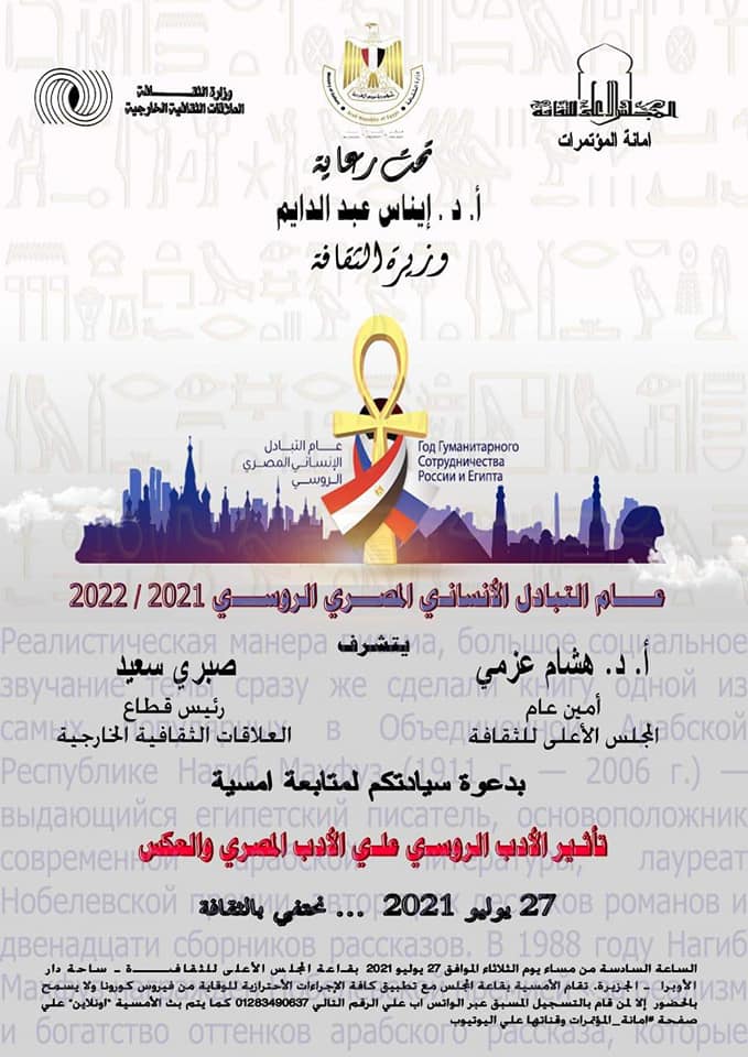وأعلنت أنه في إطار أجندة فعاليات عام التبادل الانسانى المصري الروسي التي أعدتها وزارة الثقافة، ينظم قطاع العلاقات الثقافية الخارجية، الثلاثاء المقبل، بالتعاون مع عدد من الجهات المصرية والروسية، ندوة تتناول أثر الأدب الروسي علي الأدب المصري والعكس وذلك بالمجلس الأعلي للثقافة.