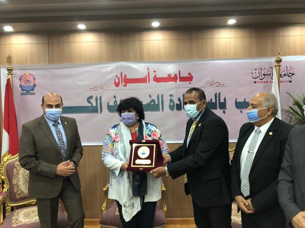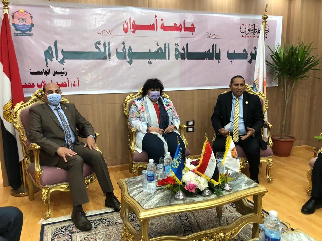 سبق افتتاح المعرض لقاء جمع وزيرة الثقافة ومحافظ اسوان ورئيس جامعة اسوان حيث تم الاتفاق على تكثيف الانشطة الابداعية فى جميع انحاء المحافظة تعزيز التواصل مع المبدعين من ابناءها ، كما قامت وزيرة الثقافة باهداء كل من محافظ اسوان ورئيس جامعة اسوان درعين تذكاريين تقديرا لجهودهما فى دعم الابداع.