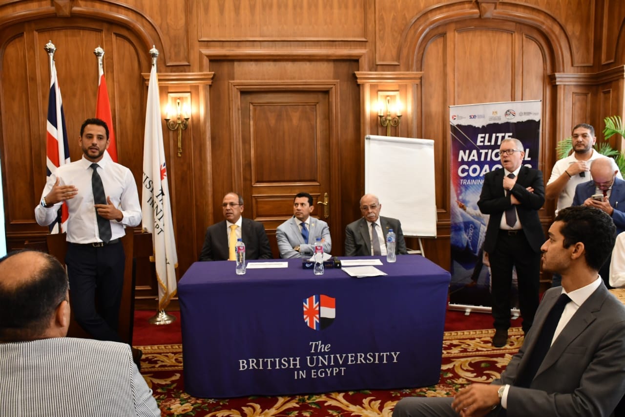 وأضاف أن الجامعة البريطانية تسعي بالتعاون مع الشريك الاستراتيجي لها وهي جامعة مانشسترمتروبوليتان؛ للوصول إلى المستوى الذي يتلائم مع توجهات ورؤية الوزارة، مشيرًا إلى أن هذه هي المرة الأولى التي يتم تطبيق هذا النموذج في مصر من خلال وزارة الشباب والرياضة لتوفير كافة وسائل الدعم اللوجستية للمدربين والتدريب.