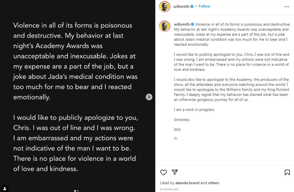 قدّم الممثّل ويل سميث عبر إنستجرام اعتذاره لزميله كريس روك على صفعه إياه مساء الأحد خلال حفل توزيع جوائز الأوسكار بسبب دعابة سخر فيها الممثل الفكاهي من الرأس الحليق لجيدا بينكت سميث، زوجة الممثل الهوليوودي المصابة بداء الثعلبة.