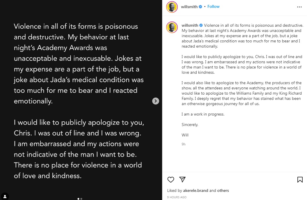 وشدّد النجم الهوليوودي في اعتذاره على أنّ “العنف بكلّ أشكاله مسمّم ومدمّر. ما قمت به الليلة الماضية في حفل توزيع جوائز الأوسكار غير مقبول ولا يُغتفر”.