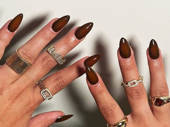 ألوان البني الداكنة مستوحاة من مشروبات الشتاء الساخنة مثل القهوة والاسبريسو، وتضفي لمسة من الفخامة على أصابع قدميك ويدك، كما يمكن تجربة موكا منتصف الليل للحصول على تأثير لامع يشبه الجل، مما يجعل المانكير مناسبًا للمناسبات والأيام الباردة على حد سواء.