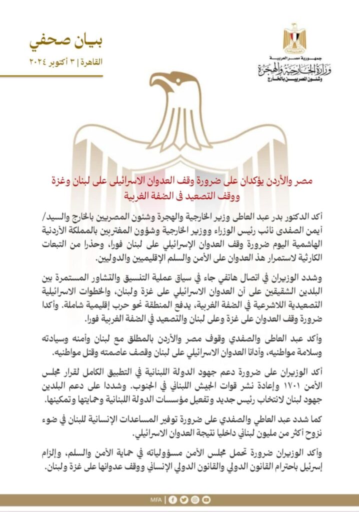 وأكد الوزيران ضرورة وقف العدوان على غزة وعلى لبنان والتصعيد في الضفة الغربية فورا، كما أكدا وقوف مصر والأردن بالمطلق مع لبنان وأمنه وسيادته وسلامة مواطنيه، وأدانا العدوان الإسرائيلي على لبنان وقصف عاصمته وقتل مواطنيه.