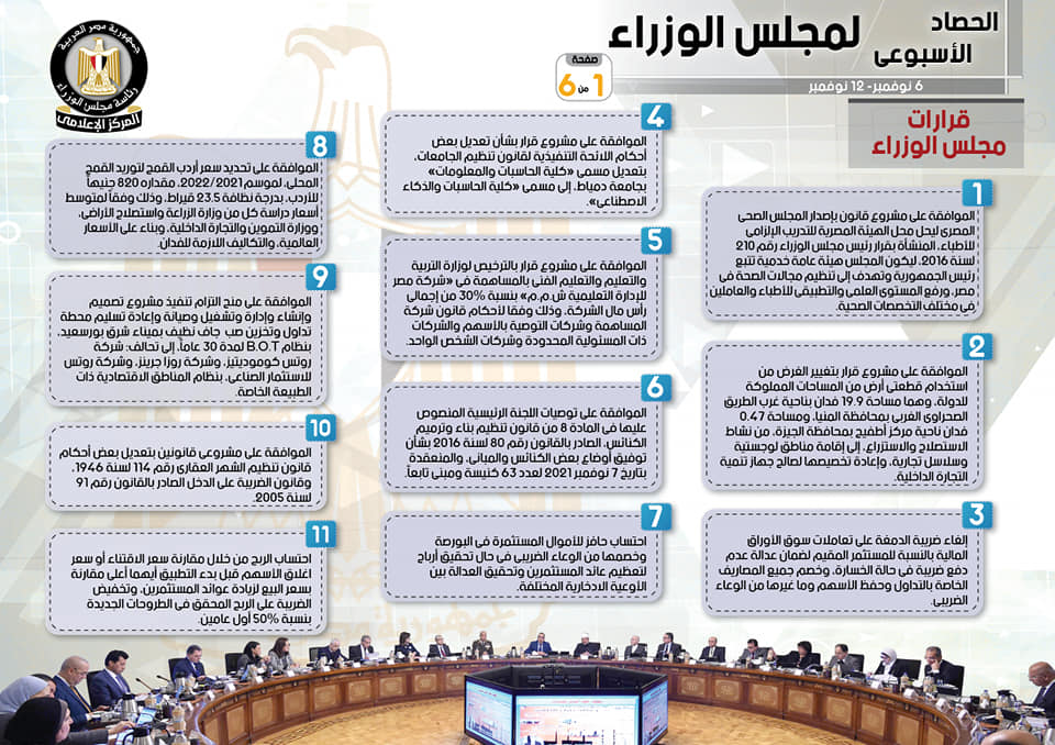 وجاء في التقرير أنه تم إصدار عدد من القرارات، تشمل الموافقة على مشروعي قانونين بتعديل بعض أحكام قانون تنظيم الشهر العقاري رقم 114 لسنة 1946، وقانون الضريبة على الدخل الصادر بالقانون رقم 91 لسنة 2005، بالإضافة إلى الموافقة على مشروع قانون بإصدار المجلس الصحي المصري ليحل محل الهيئة المصرية للتدريب الإلزامي للأطباء، المنشأة بقرار رئيس مجلس الوزراء رقم 210 لسنة 2016، ليكون المجلس هيئة عامة خدمية تتبع رئيس الجمهورية وتهدف إلى تنظيم مجالات الصحة في مصر، ورفع المستوى العلمي والتطبيقي للأطباء والعاملين في مختلف التخصصات الصحية.