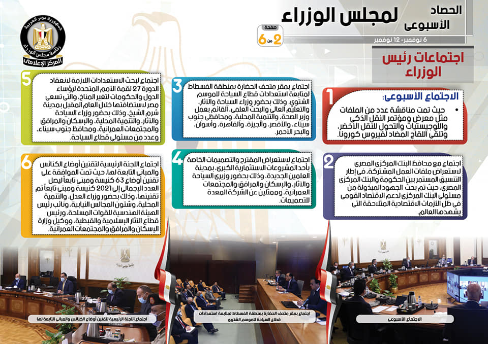 وتضمنت الاجتماعات أيضاً، وفقاً لما أبرزه التقرير، عقد رئيس الوزراء اجتماع لبحث الاستعدادات اللازمة لانعقاد الدورة 27 لقمة الأمم المتحدة لرؤساء الدول والحكومات لتغير المناخ، والتي تسعى مصر لاستضافتها خلال العام المقبل بمدينة شرم الشيخ، وذلك بحضور وزراء السياحة والآثار، والتنمية المحلية، والإسكان والمرافق والمجتمعات العمرانية، ومحافظ جنوب سيناء، وعدد من مسئولي قطاع السياحة، إلى جانب عقد اجتماع اللجنة الرئيسية لتقنين أوضاع الكنائس والمباني التابعة لها، حيث تمت الموافقة على تقنين أوضاع 63 كنيسة ومبنى تابعاً ليصل العدد الإجمالي إلى 2021 كنيسة ومبنى تابعاً تم تقنينها، وذلك بحضور وزراء العدل، والتنمية المحلية، وشئون المجالس النيابية، ونائب رئيس الهيئة الهندسية للقوات المسلحة، ورئيس قطاع الآثار الإسلامية والقبطية، ووكيل وزارة الإسكان والمرافق والمجتمعات العمرانية.