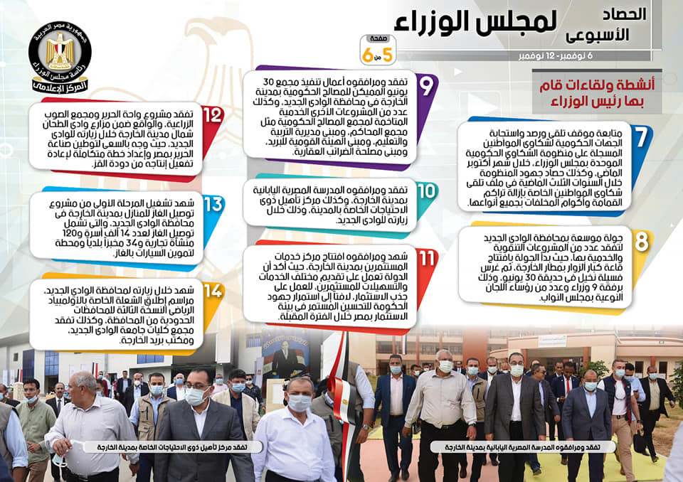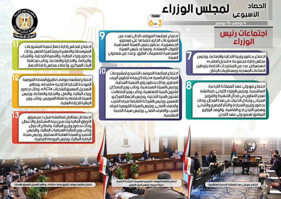 نشر المركز الإعلامي لمجلس الوزراء، اليوم الجمعة، تقريرا شمل إنفوجرافات سلط من خلالها الضوء على الحصاد الأسبوعي لمجلس الوزراء، وذلك خلال الفترة من 6 حتى 12 نوفمبر 2021، والذي تضمن الموافقة على عدد من القرارات، فضلاً عن الاجتماعات واللقاءات التي عقدها مصطفى مدبولي، رئيس مجلس الوزراء، بالإضافة إلى ما قام به من أنشطة.