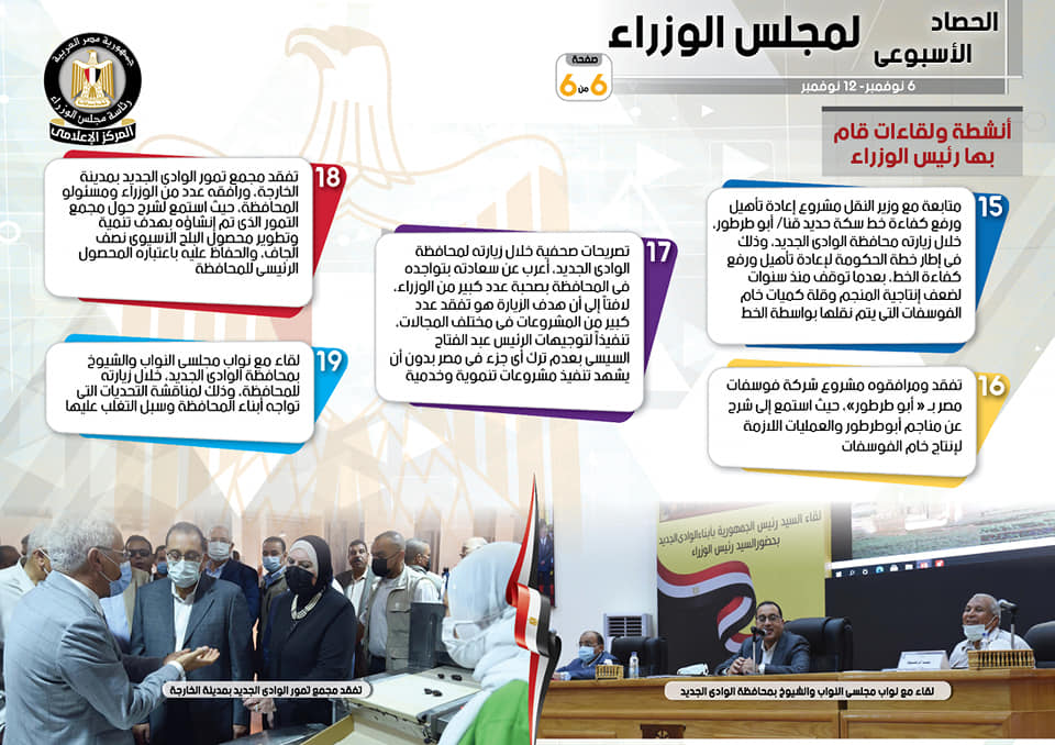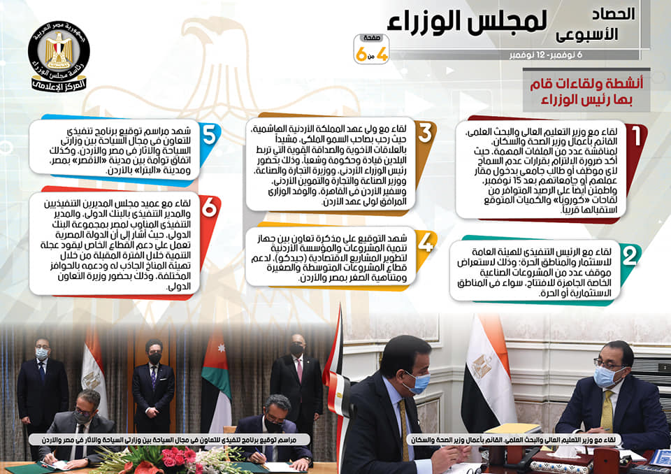 أما بشأن اللقاءات التي عقدها مصطفى مدبولي رئيس مجلس الوزراء على مدار الأسبوع، أظهر التقرير، لقاء مع وزير التعليم العالي والبحث العلمي، القائم بأعمال وزير الصحة والسكان، لمناقشة عدد من الملفات المهمة، حيث أكد ضرورة الالتزام بقرارات عدم السماح لأي موظف أو طالب جامعي بدخول مقار عملهم أو جامعاتهم بعد 15 نوفمبر، واطمئن أيضاً على الرصيد المتوافر من لقاحات “كورونا” والكميات المتوقع استقبالها قريباً، بالإضافة إلى لقاء سيادته مع عميد مجلس المديرين التنفيذيين والمدير التنفيذى بالبنك الدولي، والمدير التنفيذي المناوب لمصر بمجموعة البنك الدولي، حيث أشار إلى أن الدولة المصرية تعمل على دعم القطاع الخاص ليقود عجلة التنمية خلال الفترة المقبلة من خلال تهيئة المناخ الجاذب له ودعمه بالحوافز المختلفة، وذلك بحضور وزيرة التعاون الدولي.