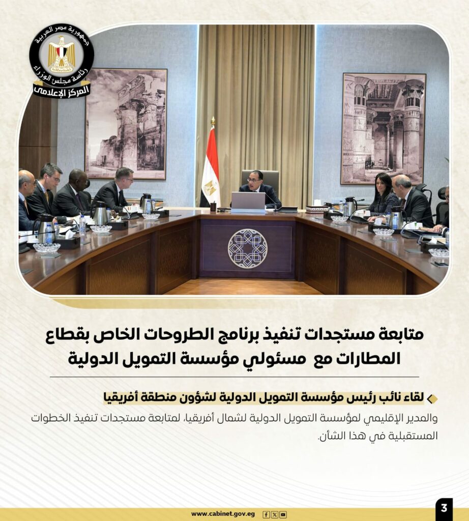 وأضاف التقرير أن رئيس الوزراء تابع مستجدات تنفيذ برنامج الطروحات الخاص بقطاع المطارات مع مسئولي مؤسسة التمويل الدولية، حيث التقى بنائب رئيس مؤسسة التمويل الدولية لشؤون منطقة أفريقيا، والمدير الإقليمي لمؤسسة التمويل الدولية لشمال أفريقيا، لمتابعة مستجدات تنفيذ الخطوات المستقبلية في هذا الشأن.