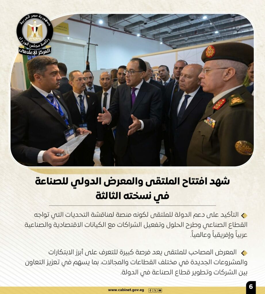 وذكر التقرير أن رئيس الوزراء شهد افتتاح الملتقى والمعرض الدولي للصناعة في نسخته الثالثة، حيث أكد على دعم الدولة للملتقى لكونه منصة لمناقشة التحديات التي تواجه القطاع الصناعي وطرح الحلول وتفعيل الشراكات مع الكيانات الاقتصادية والصناعية عربياً وإفريقياً وعالمياً، كما أوضح أن المعرض المصاحب للملتقى يعد فرصة كبيرة للتعرف على أبرز الابتكارات والمشروعات الجديدة في مختلف القطاعات والمجالات، بما يسهم في تعزيز التعاون بين الشركات وتطوير قطاع الصناعة في الدولة.