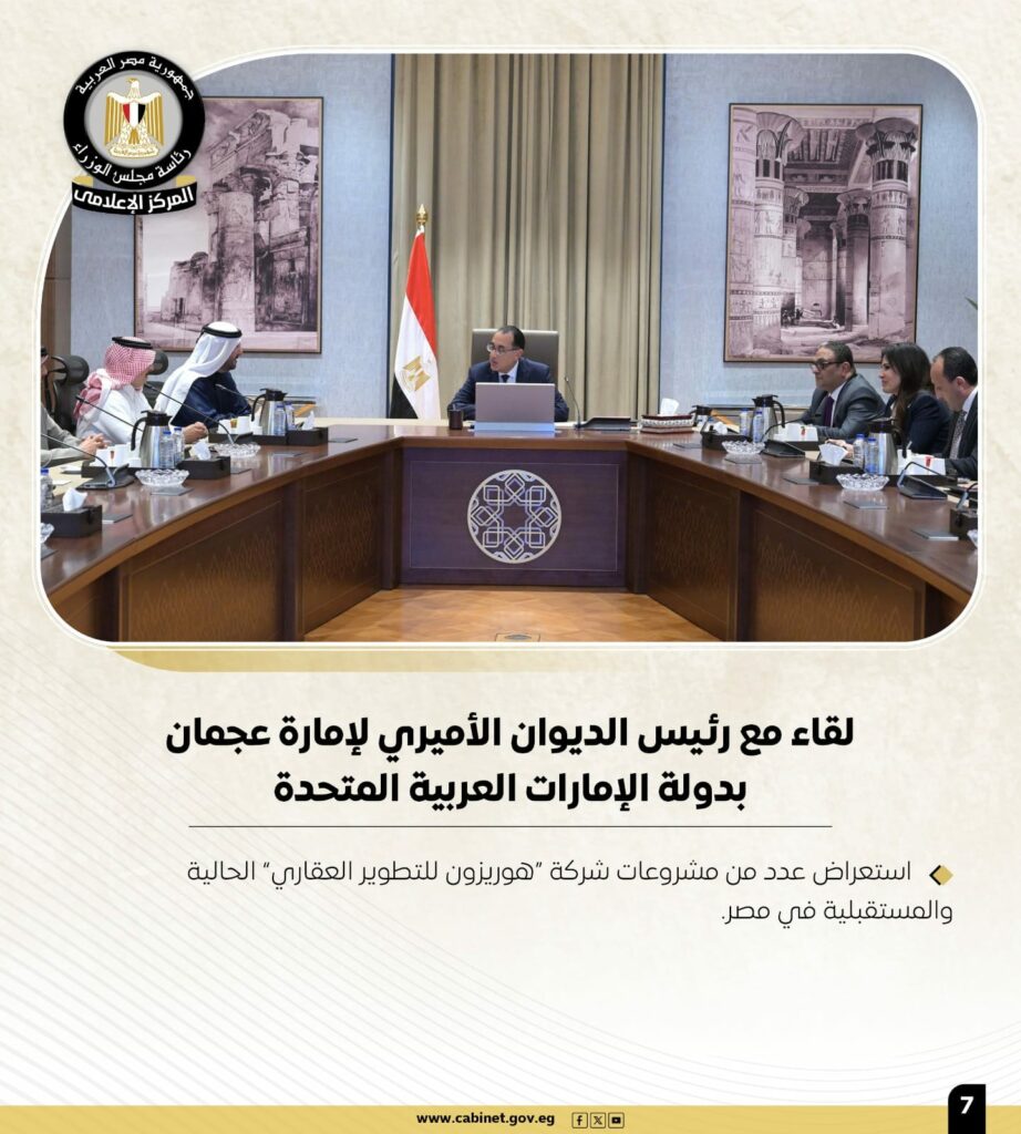وعلى صعيد اللقاءات التي قام بها رئيس الوزراء، تطرق التقرير إلى لقائه مع رئيس الديوان الأميري لإمارة عجمان بدولة الإمارات العربية المتحدة، حيث تم خلال اللقاء استعراض عدد من مشروعات شركة “هوريزون للتطوير العقاري” الحالية والمستقبلية في مصر.