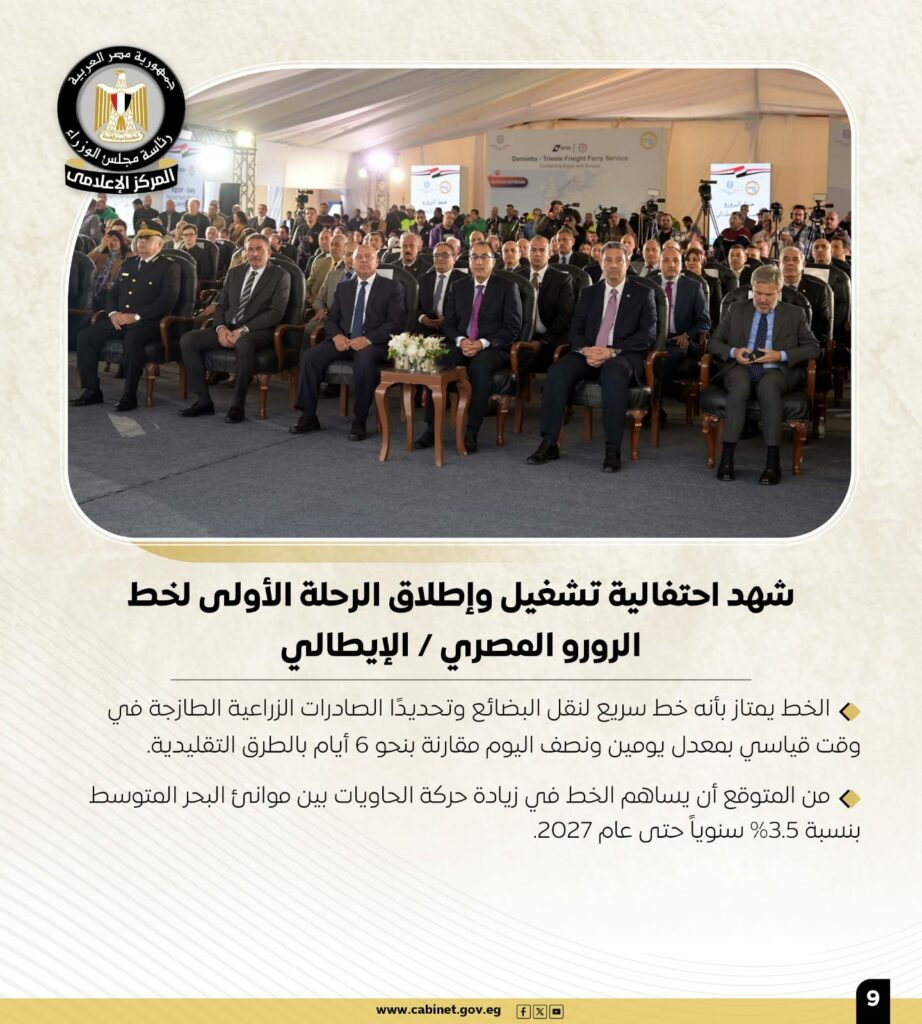 وفي سياق متصل، شهد رئيس الوزراء احتفالية تشغيل وإطلاق الرحلة الأولى لخط الرورو المصري / الإيطالي، موضحاً أن الخط يمتاز بالسرعة في نقل البضائع وتحديدًا الصادرات الزراعية الطازجة في وقت قياسي بمعدل يومين ونصف اليوم مقارنة بنحو 6 أيام بالطرق التقليدية، ومن المتوقع أن يساهم الخط في زيادة حركة الحاويات بين موانئ البحر المتوسط بنسبة 3.5% سنوياً حتى عام 2027.