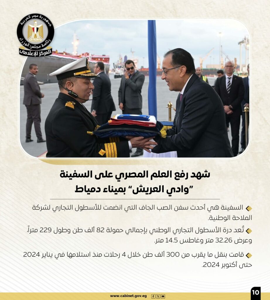 وبجانب ما سبق، ذكر التقرير أن رئيس مجلس الوزراء شهد رفع العلم المصري على السفينة “وادي العريش” بميناء دمياط، موضحاً أن السفينة هي أحدث سفن الصب الجاف التي انضمت للأسطول التجاري لشركة الملاحة الوطنية.
