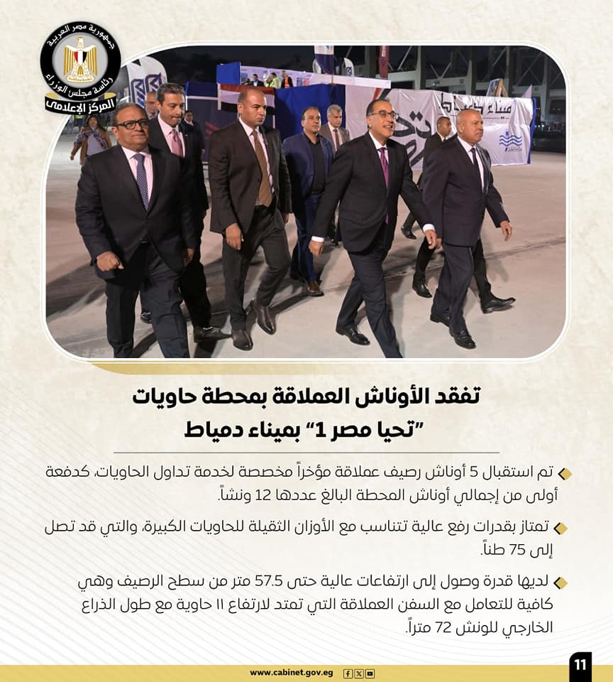 وأخيراً، تفقد رئيس الوزراء الأوناش العملاقة بمحطة حاويات “تحيا مصر 1” بميناء دمياط، علماً بأنه تم استقبال 5 أوناش رصيف عملاقة مؤخراً مخصصة لخدمة تداول الحاويات، كدفعة أولى من إجمال أوناش المحطة البالغ عددها 12 ونشاً، فيما تمتاز بقدرات رفع عالية تتناسب مع الأوزان الثقيلة للحاويات الكبيرة، والتي قد تصل إلى 75 طناً، ولديها قدرة وصول إلى ارتفاعات عالية حتى 57.5 متر من سطح الرصيف وهي كافية للتعامل مع السفن العملاقة التي تمتد لارتفاع 11 حاوية مع طول الذراع الخارجي للونش 72 متراً.