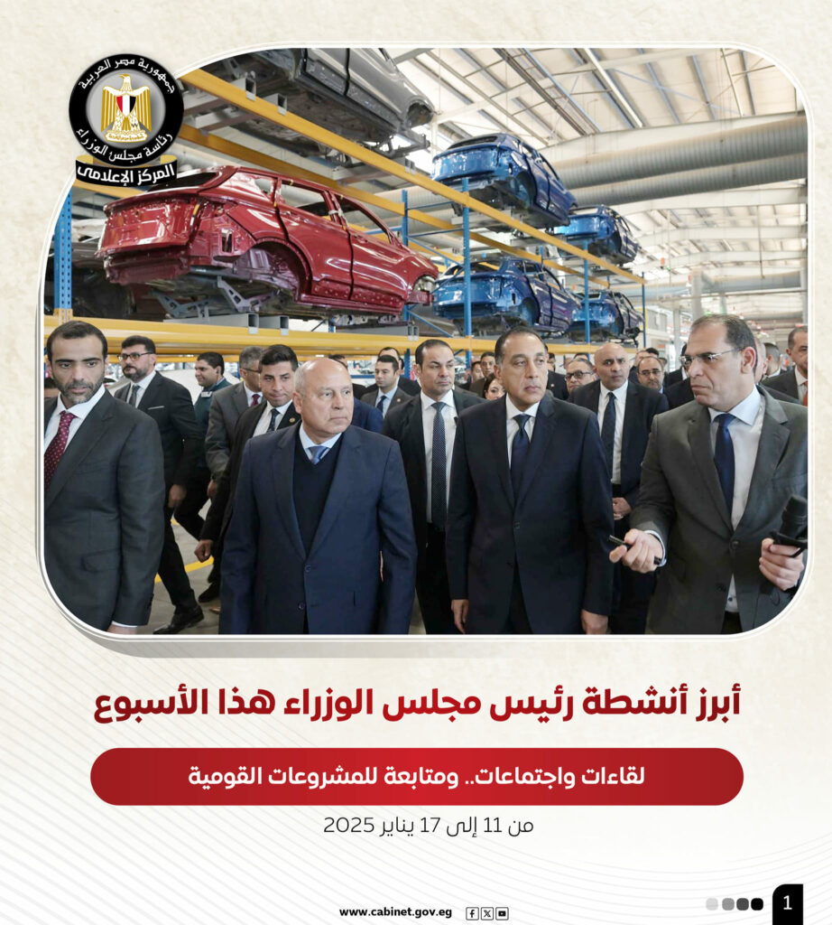 قام مصطفى مدبولى، رئيس مجلس الوزراء، خلال الأسبوع الجارى من 11 إلى 17 يناير، بعدد من الأنشطة التى شملت سلسلة من الزيارات الميدانية والاجتماعات التى تؤكد التزام الحكومة بخطط التنمية الاقتصادية والاجتماعية وتعزيز البنية التحتية، وفتح آفاق جديدة للاستثمار فى مجالات التكنولوجيا والصناعة، فضلًا عن تحسين جودة الخدمات المقدمة للمواطنين، بما يعزز مبادئ العدالة الاجتماعية، علاوة على متابعة آخر المستجدات المتعلقة بعدد من المشروعات السياحية الاستراتيجية، فى إطار الحرص على الاستغلال الأمثل للإمكانات السياحية والطبيعية لتلك المناطق، لتعكس تلك الجهود رؤية الدولة المصرية لتحقيق التنمية الشاملة والمستدامة فى مختلف القطاعات، وأهمية مواصلة الجهود الوطنية لدعم القطاعات الحيوية ذات الأولوية.