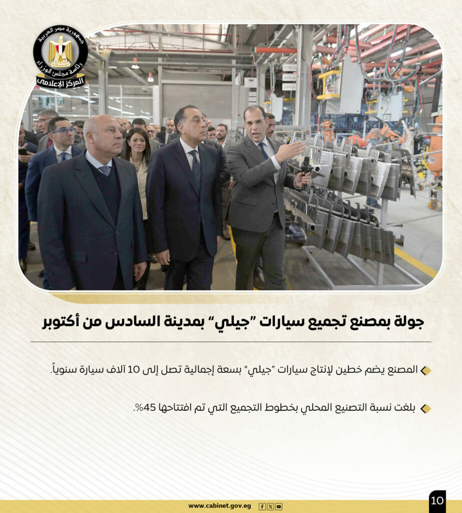 كما قام السيد رئيس مجلس الوزراء، وفقًا للتقرير، بجولة بمصنع تجميع سيارات “جيلي” بمدينة السادس من أكتوبر، والذي يضم خطين لإنتاج سيارات “جيلي” بسعة إجمالية تصل إلى 10 آلاف سيارة سنويًا، وبلغت نسبة التصنيع المحلي بخطوط التجميع التي تم افتتاحها 45%.
