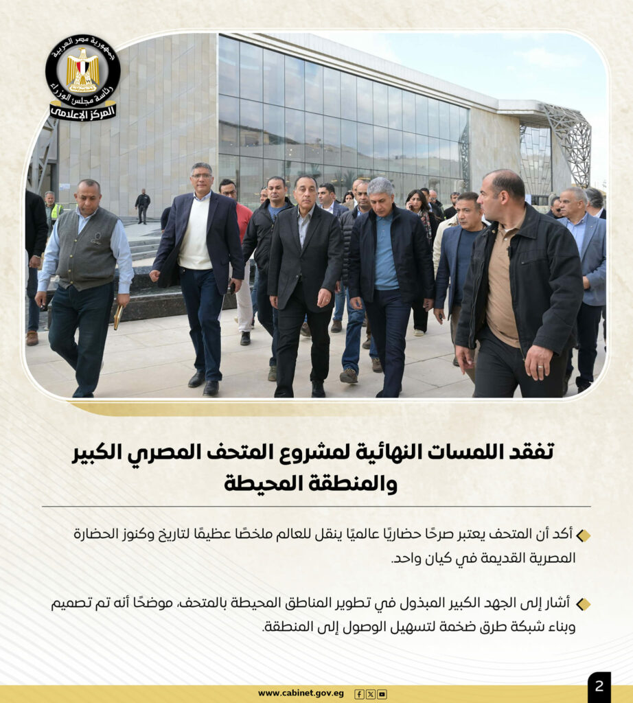وجاء في التقرير الأسبوعى الصادر عن المركز الإعلامى لمجلس الوزراء أن نشاط مصطفى مدبولى شمل تفقد اللمسات النهائية لمشروع المتحف المصرى الكبير والمنطقة المحيطة، وقد أكد أن المتحف يعتبر صرحًا حضاريًا عالميًا ينقل للعالم ملخصًا عظيمًا لتاريخ وكنوز الحضارة المصرية القديمة فى كيان واحد.