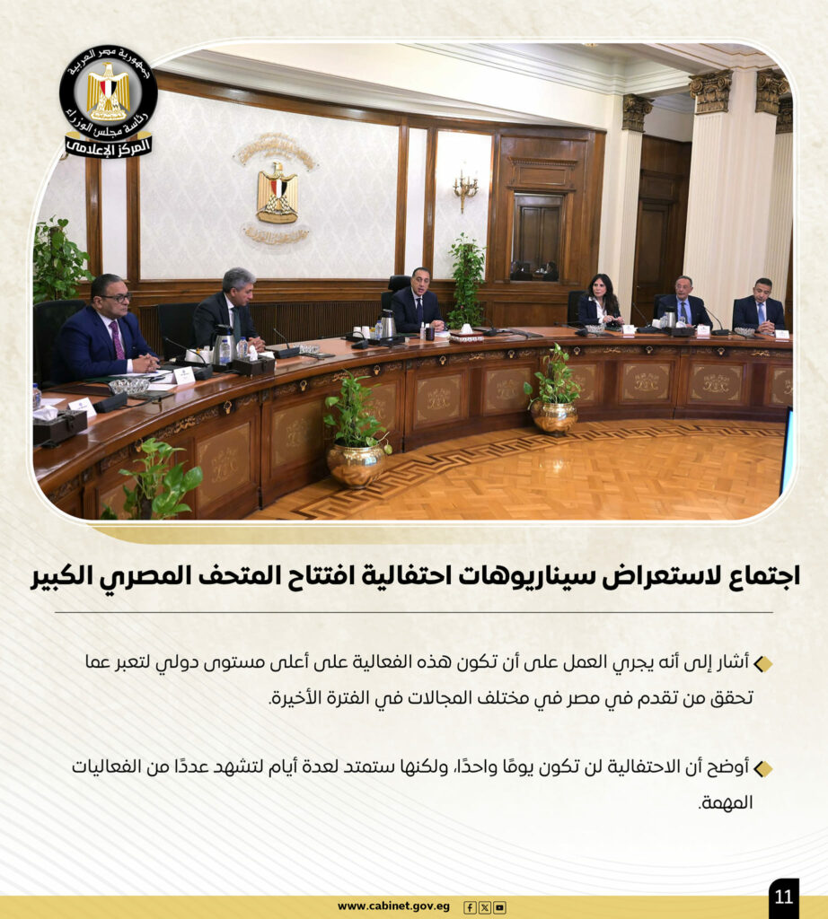 وأخيرًا، عقد اجتماعًا لاستعراض سيناريوهات احتفالية افتتاح المتحف المصري الكبير، وقد أشار سيادته إلى أنه يجري العمل على أن تكون هذه الفعالية على أعلى مستوى دولي لتعبر عما تحقق من تقدم في مصر في مختلف المجالات في الفترة الأخيرة، موضحًا أن الاحتفالية لن تكون يومًا واحدًا، ولكنها ستمتد لعدة أيام لتشهد عددًا من الفعاليات المهمة.