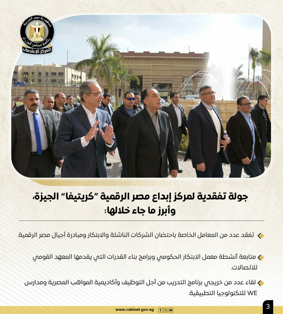 يأتي هذا فيما قام رئيس مجلس الوزراء أيضًا بجولة تفقدية لمركز إبداع مصر الرقمية “كريتيفا” الجيزة، وقد أشار التقرير إلى أبرز ما جاء خلالها حيث تفقد عددًا من المعامل الخاصة باحتضان الشركات الناشئة والابتكار ومبادرة أجيال مصر الرقمية والبرمجة، فضلًا عن متابعة أنشطة معمل الابتكار الحكومي وبرامج بناء القدرات التى يقدمها المعهد القومي للاتصالات، وكذلك لقاء عدد من خريجي برنامج التدريب من أجل التوظيف وأكاديمية المواهب المصرية ومدارس WE للتكنولوجيا التطبيقية.