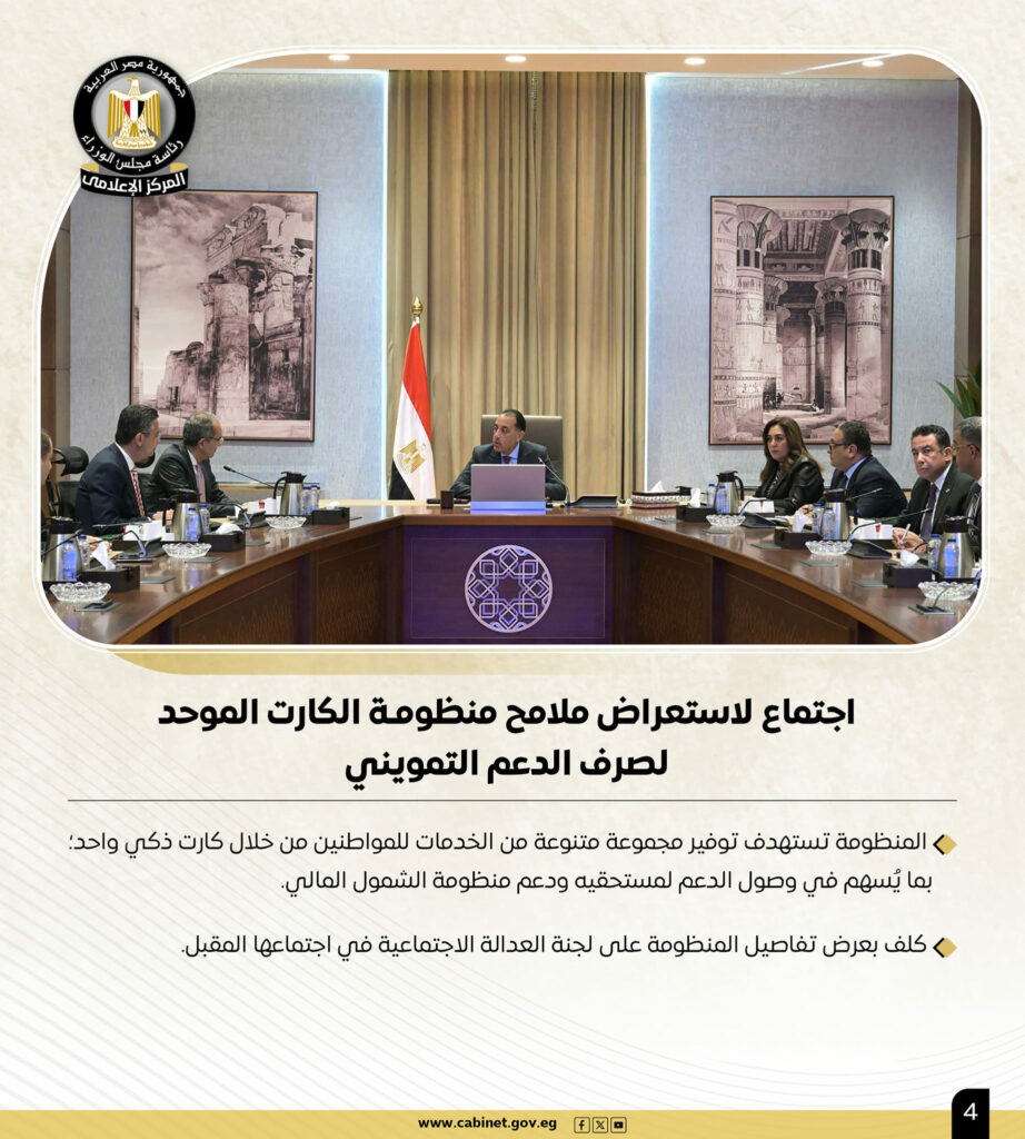 وإلى جانب ما سبق، عقد رئيس الوزراء اجتماعًا لاستعراض ملامح منظومـة الكارت الموحد لصرف الدعم التمويني، حيث تستهدف المنظومة توفير مجموعة متنوعة من الخدمات للمواطنين من خلال كارت ذكي واحد؛ بما يسهم في وصول الدعم لمستحقيه ودعم منظومة الشمول المالي، كما كلف بعرض تفاصيل المنظومة على لجنة العدالة الاجتماعية في اجتماعها المقبل.