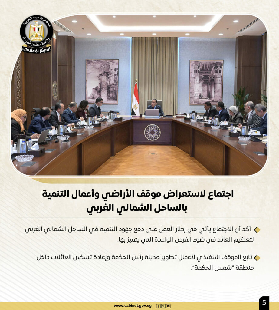 وتضمن نشاط رئيس مجلس الوزراء خلال الأسبوع الجاري، وفقًا للتقرير، عقد اجتماع لاستعراض موقف الأراضي وأعمال التنمية بالساحل الشمالي الغربي، وقد أكد أن الاجتماع يأتى فى إطار العمل على دفع جهود التنمية فى الساحل الشمالى الغربى لتعظيم العائد فى ضوء الفرص الواعدة التي يتميز بها، كما تابع الموقف التنفيذى لأعمال تطوير مدينة رأس الحكمة وإعادة تسكين العائلات داخل منطقة “شمس الحكمة”.