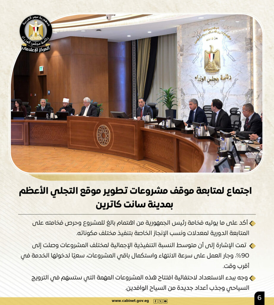 هذا وقد عقد رئيس الوزراء اجتماعًا لمتابعة موقف مشروعات تطوير موقع التجلي الأعظم بمدينة سانت كاترين، مؤكدًا على ما يوليه رئيس الجمهورية من اهتمام بالغ للمشروع وحرص فخامته على المتابعة الدورية لمعدلات ونسب الإنجاز الخاصة بتنفيذ مختلف مكوناته، كما تمت الإشارة إلى أن متوسط النسبة التنفيذية الإجمالية لمختلف المشروعات وصلت إلى 90%، وجار العمل على سرعة الانتهاء واستكمال باقي المشروعات، سعيًا لدخولها الخدمة في أقرب وقت.