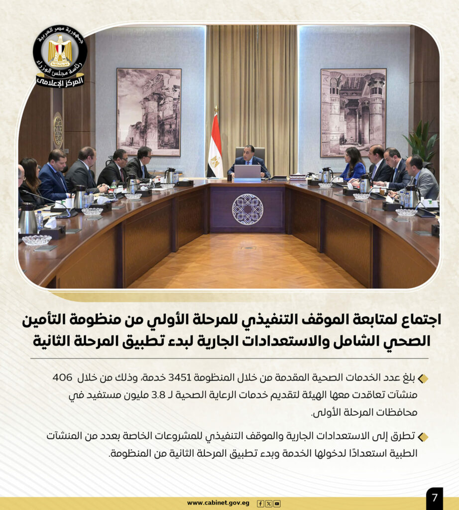 وإلى جانب ما سبق، فقد عقد رئيس الوزراء اجتماعًا لمتابعة الموقف التنفيذي للمرحلة الأولي من منظومة التأمين الصحى الشامل والاستعدادات الجارية لبدء تطبيق المرحلة الثانية، حيث بلغ عدد الخدمات الصحية المقدمة من خلال المنظومة 3451 خدمة، وذلك من خلال 406 منشآت تعاقدت معها الهيئة لتقديم خدمات الرعاية الصحية لـ 3.8 مليون مستفيد في محافظات المرحلة الأولى.
