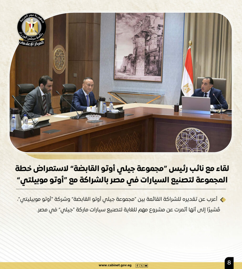 وخلال الأسبوع الجاري، عقد رئيس الوزراء لقاءً مع نائب رئيس “مجموعة جيلي أوتو القابضة” لاستعراض خطة المجموعة لتصنيع السيارات في مصر بالشراكة مع “أوتو موبيلتي”، وقد أعرب سيادته عن تقديره للشراكة القائمة بين “مجموعة جيلي أوتو القابضة” وشركة “أوتو موبيليتي”، مُشيرًا إلى أنها أثمرت عن مشروع مهم للغاية لتصنيع سيارات ماركة “جيلي” في مصر.