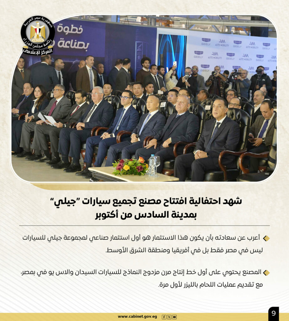 وورد في التقرير أن رئيس الوزراء شهد خلال الأسبوع الجاري احتفالية افتتاح مصنع تجميع سيارات “جيلي” بمدينة السادس من أكتوبر، معربًا عن سعادته بأن يكون هذا الاستثمار هو أول استثمار صناعي لمجموعة جيلي للسيارات ليس في مصر فقط بل في أفريقيا ومنطقة الشرق الأوسط، حيث يحتوي المصنع على أول خط إنتاج مرن مزدوج النماذج للسيارات (السيدان) و(الاس يو في) بمصر، مع تقديم عمليات اللحام بالليزر لأول مرة.
