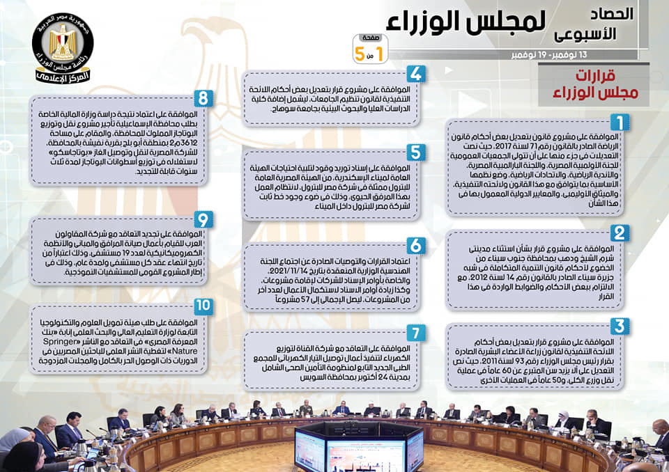 وجاء في التقرير أنه تم إصدار عدد من القرارات، تشمل الموافقة على مشروع قانون بتعديل بعض أحكام قانون الرياضة الصادر بالقانون رقم 71 لسنة 2017، حيث نصت التعديلات في جزء منها على أن تتولى الجمعيات العمومية للجنة الأولمبية المصرية، واللجنة البارالمبية المصرية، والأندية الرياضية، والاتحادات الرياضية، وضع نظمها الأساسية بما يتوافق مع هذا القانون ولائحته التنفيذية، والميثاق الأوليمبي، والمعايير الدولية المعمول بها في هذا الشأن، فضلاً عن الموافقة على مشروع قرار بشأن استثناء مدينتي شرم الشيخ ودهب بمحافظة جنوب سيناء من الخضوع لأحكام قانون التنمية المتكاملة في شبه جزيرة سيناء الصادر بالقانون رقم 14 لسنة 2012، مع الالتزام ببعض الأحكام والضوابط الواردة في هذا القرار، بالإضافة إلى الموافقة على مشروع قرار بتعديل بعض أحكام اللائحة التنفيذية لقانون زراعة الأعضاء البشرية الصادرة بقرار رئيس مجلس الوزراء رقم 93 لسنة 2011، حيث نص التعديل على ألا يزيد سن المتبرع عن 60 عاماً في عملية نقل وزرع الكلى، و50 عاماً في العمليات الأخرى، وكذلك الموافقة على مشروع قرار بتعديل بعض أحكام اللائحة التنفيذية لقانون تنظيم الجامعات، ليشمل إضافة كلية الدراسات العليا والبحوث البيئية بجامعة سوهاج.
