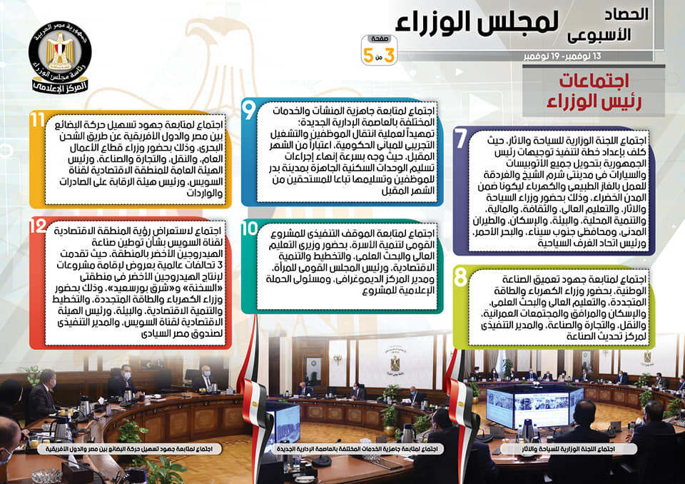وتضمنت الاجتماعات أيضاً كما جاء في التقرير، اجتماعاً لمتابعة الموقف التنفيذي للمشروع القومي لتنمية الأسرة، بحضور وزيري التعليم العالي والبحث العلمي، والتخطيط والتنمية الاقتصادية، ورئيس المجلس القومي للمرأة، ومدير المركز الديموغرافي، ومسئولي الحملة الإعلامية للمشروع، بالإضافة إلى اجتماع لمتابعة جاهزية المنشآت والخدمات المختلفة بالعاصمة الإدارية الجديدة؛ تمهيداً لعملية انتقال الموظفين والتشغيل التجريبي للمباني الحكومية، اعتباراً من الشهر المقبل، حيث وجه بسرعة إنهاء إجراءات تسليم الوحدات السكنية الجاهزة بمدينة بدر للموظفين وتسليمها تباعًا للمستحقين من الشهر المقبل، فضلاً عن اجتماع لاستعراض رؤية المنطقة الاقتصادية لقناة السويس بشأن توطين صناعة الهيدروجين الأخضر بالمنطقة، حيث تقدمت 3 تحالفات عالمية بعروض لإقامة مشروعات لإنتاج الهيدروجين الأخضر في منطقتي “السخنة” و”شرق بورسعيد”، وذلك بحضور وزراء الكهرباء والطاقة المتجددة، والتخطيط والتنمية الاقتصادية، والبيئة، ورئيس الهيئة الاقتصادية لقناة السويس، والمدير التنفيذي لصندوق مصر السيادي.