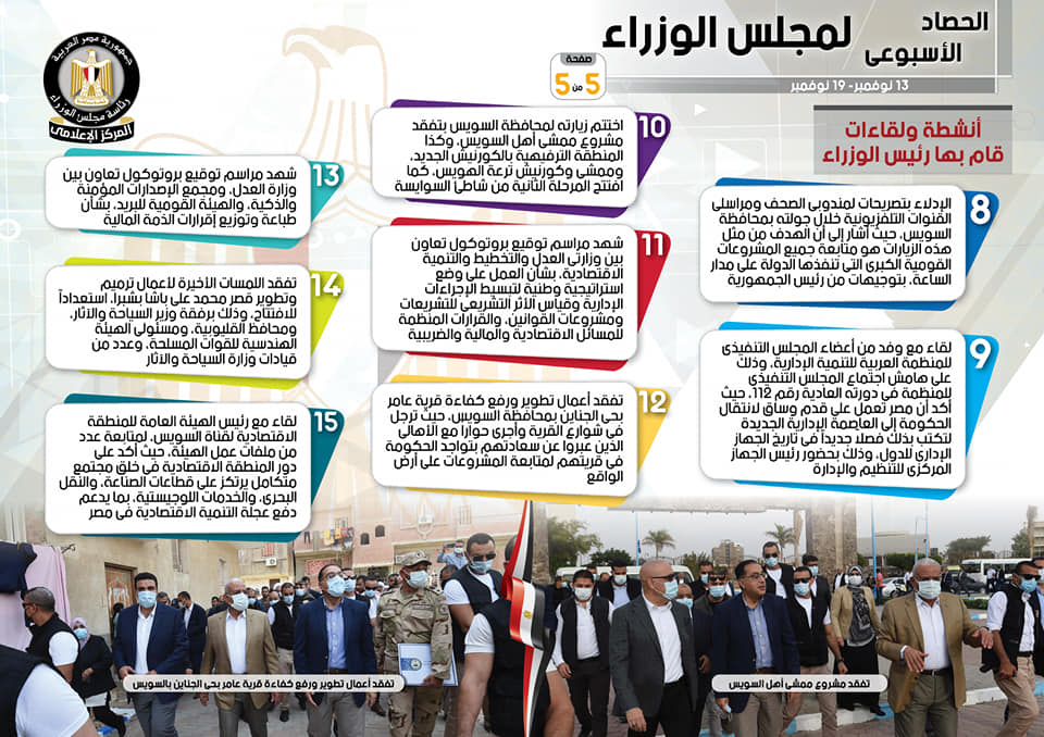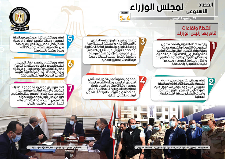 وبشأن الأنشطة التي قام بها رئيس مجلس الوزراء، فبحسب التقرير، شملت زيارة محافظة السويس لتفقد عدد من المشروعات التنموية والخدمية، وذلك برفقة وزراء التعليم العالي والبحث العلمي القائم بعمل وزير الصحة، والتنمية المحلية، والإسكان والمرافق والمجتمعات العمرانية، والنقل، ومحافظ السويس، وعدد من القيادات التنفيذية بالمحافظة، وكذلك متابعة مشروع تطوير حديقة الخالدين والنصب التذكاري والمنطقة المحيطة بها، ووحدة الطوارئ والسلامة العامة المتطورة بمحافظة السويس، حيث أشار إلى اهتمام رئيس الجمهورية بإقامة شبكة موحدة ومؤمنة بالكامل لجميع الجهات بالدولة طبقاً لأحدث المعايير العالمية، إلى جانب تفقد سيادته محطتي رفع صرف صحي “زرب” القديمة والجديدة أثناء زيارته لمحافظة السويس، حيث وجه بتوفير 30 مليون جنيه كمرحلة أولى لمشروع تطوير قرية عامر والصرف المغطى بمدينة الشيخ خليفة السكنية.