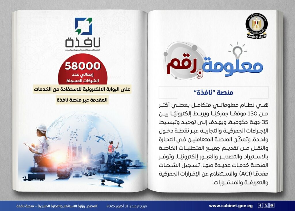 قال المركز الإعلامي لمجلس الوزراء أن منصة “نافذة ” تسعى إلى تسهيل الإجراءات الجمركية واللوجيستية من خلال تقديم جميع الخدمات إلكترونيًا في مكان واحد، بما في ذلك متابعة حالة البيان الجمركي، ونظام التسجيل المسبق للشحنات (ACI).