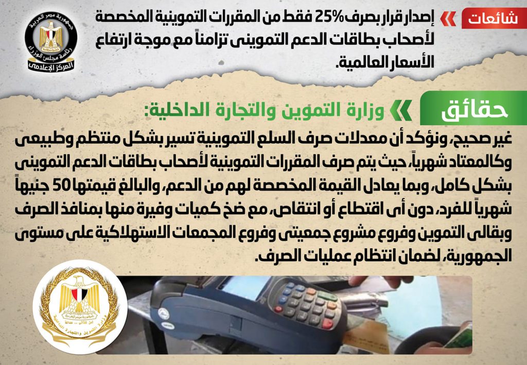 نفى المركز الإعلامي لمجلس الوزراء إصدار قرار بصرف 25% فقط من المقررات التموينية المخصصة لأصحاب بطاقات الدعم التمويني تزامناً مع موجة ارتفاع الأسعار العالمية، وقد قام المركز الإعلامي لمجلس الوزراء بالتواصل مع وزارة التموين والتجارة الداخلية، والتي نفت تلك الأنباء، مُؤكدةً أنه لا صحة لإصدار قرار بصرف 25% فقط من المقررات التموينية المخصصة لأصحاب بطاقات الدعم التمويني تزامناً مع موجة ارتفاع الأسعار العالمية، وأن معدلات صرف السلع التموينية تسير بشكل منتظم وطبيعي وكالمعتاد شهرياً، حيث يتم صرف المقررات التموينية لأصحاب بطاقات الدعم التمويني بشكل كامل، وبما يعادل القيمة المخصصة لهم من الدعم، والبالغ قيمتها 50 جنيهاً شهرياً للفرد، دون أي اقتطاع أو انتقاص، مع ضخ كميات وفيرة منها بمنافذ الصرف وبقالي التموين وفروع مشروع جمعيتي وفروع المجمعات الاستهلاكية على مستوى الجمهورية، لضمان انتظام عمليات الصرف.