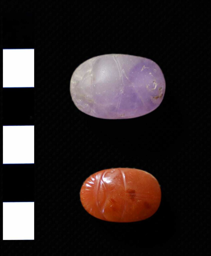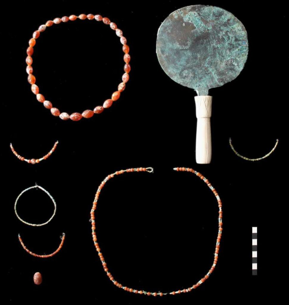 وأشارت الدكتورة كاثرين بلاكني رئيس البعثة الأثرية من الجانب الأمريكي، أنه تم العثور داخل أثنين من هذه الدفنات على مرايا من النحاس أحدهم ذات مقبض على شكل زهرة اللوتس، وأخرى بتصميم نادر لوجه الإلهة حتحور بأربعة وجوه تظهرها كامرأة ذات ملامح صارمة، بالإضافة إلى عدد من سبائك النحاس، وتمثال صغير للخصوبة من حجر الفاينس الأزرق والأخضر وله أرجل مقطوعة، مصمم بشكل جيد ومزين بمجموعة متنوعة من المجوهرات، وشعرها مطلي باللون الأسود، وقد عُثر بجوار التمثال الصغير على ما يقرب من 4000 خرزة طينية تشكل شعرها الأصلي. كما عثر على مائدة قرابين مربعة الشكل مع حافة منخفضة وقناة مياه في المنتصف محاطة بنقوش بارزة لرأس ثور ورغيف خبز وقرابين أخرى.