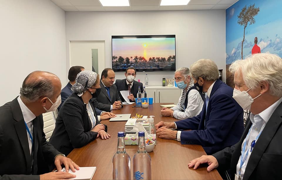 التقت الدكتورة ياسمين فؤاد وزيرة البيئة بالسيد جون كيري المبعوث الرئاسى الأمريكى للمناخ والوفد المرافق له لتهنئة مصر باستضافة مؤتمر الأطراف للتغيرات المناخية القادم COP27 وذلك على هامش مشاركة مصر بمؤتمر الأطراف السادس و العشرون لإتفاقية التغيرات المناخية Cop26 المنعقد بمدينة جلاسكو بالمملكة المتحدة.
