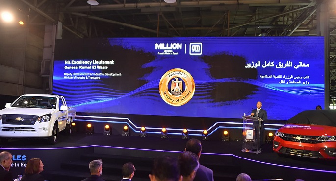 شهد نائب رئيس مجلس الوزراء للتنمية الصناعية وزير الصناعة والنقل كامل الوزير، فعاليات احتفال شركة جنرال موتورز بإنتاج المركبة المليون، وذلك بحضور وزير قطاع الأعمال العام محمد شيمي، ووزير الاستثمار والتجارة الخارجية حسن الخطيب، وسفيرة الولايات المتحدة الامريكية في مصر هيرو مصطفي، والرئيس والعضو المنتدب جنرال موتورز إفريقيا والشرق الأوسط جاك أوبال، ورئيس مجلس الإدارة والعضو المنتدب بجنرال موتورز مصر وشمال إفريقيا شارون نيشي، ورئيس مجلس إدارة مجموعة المنصور للسيارات محمد منصور.